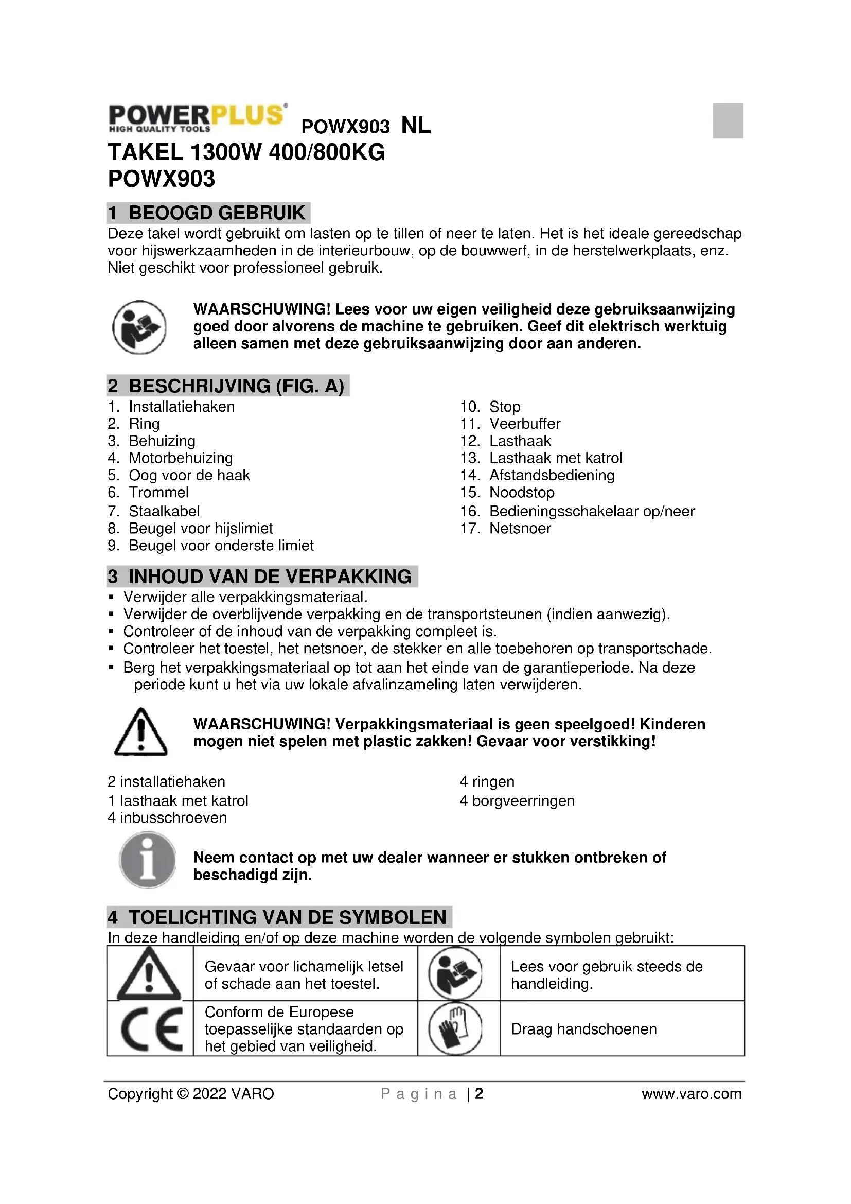 - Het is verboden om gelijk welk onderdeel van de katrol te vervangen of ze uit elkaar te halen.POWX903 NL Copyright © 2022 VARO P a g i n a | 6 www.varo.com
