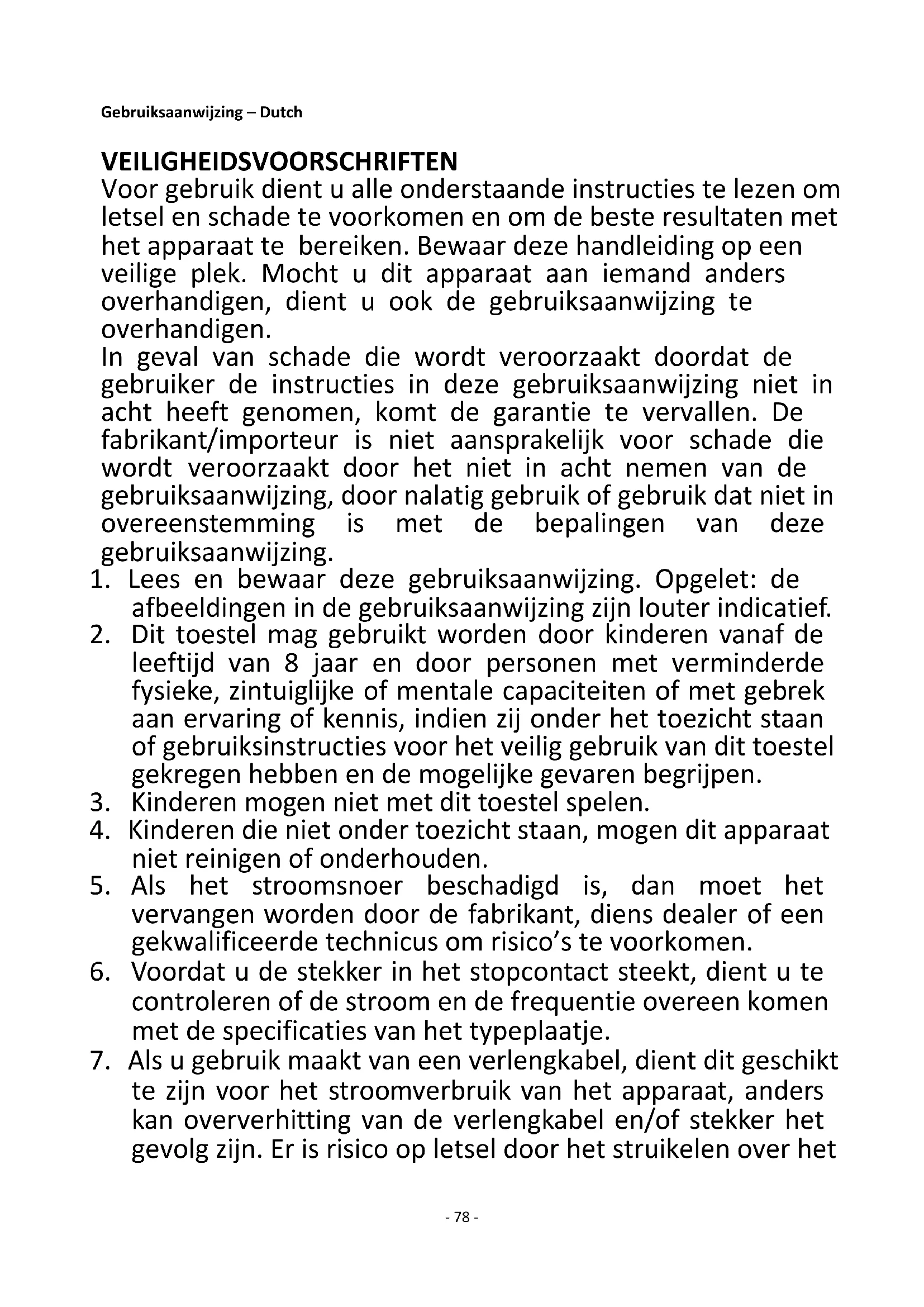 te zijn voor het stroomverbruik van het apparaat, anders kan oververhitting van de verlengkabel en/of stekker het gevolg zijn. Er is risico op letsel door het struikelen over het- 79 - verlengsnoer. Wees voorzichtig om gevaarlijke situaties te vermijden.