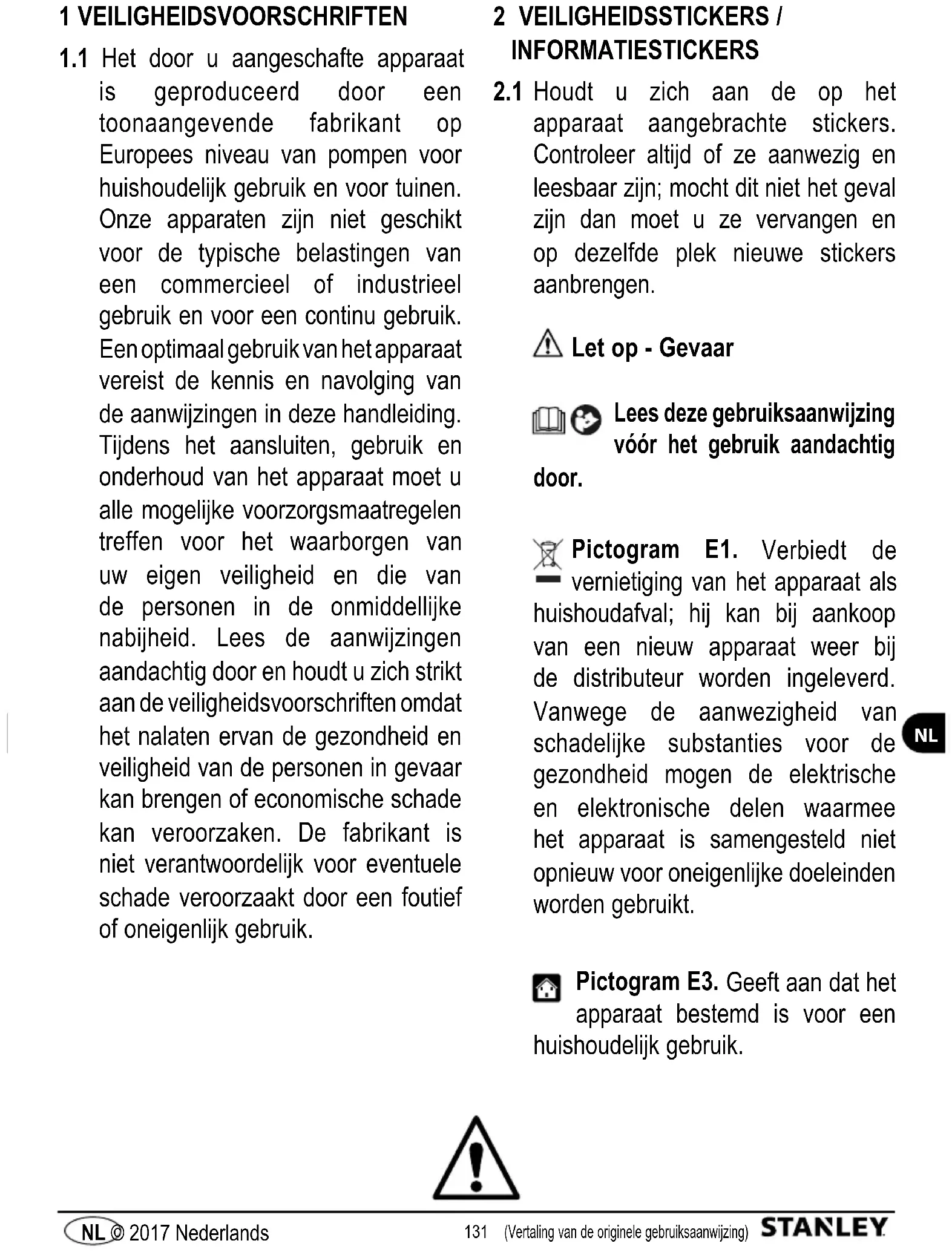 Houdt u zich aan de op het apparaat aangebrachte stickers. Controleer altijd of ze aanwezig en leesbaar zijn; mocht dit niet het geval zijn dan moet u ze vervangen en op dezelfde plek nieuwe stickers aanbrengen. Let op - Gevaar Lees deze gebruiksaanwijzing vóór het gebruik aandachtig door. Pictogram E1. Verbiedt de vernietiging van het apparaat als huishoudafval; hij kan bij aankoop van een nieuw apparaat weer bij de distributeur worden ingeleverd. Vanwege de aanwezigheid van schadelijke substanties voor de gezondheid mogen de elektrische en elektronische delen waarmee het apparaat is samengesteld niet opnieuw voor oneigenlijke doeleinden worden gebruikt. Pictogram E3. Geeft aan dat het apparaat bestemd is voor een huishoudelijk gebruik.132 (Vertaling van de originele gebruiksaanwijzing) NL © 2017 Nederlands