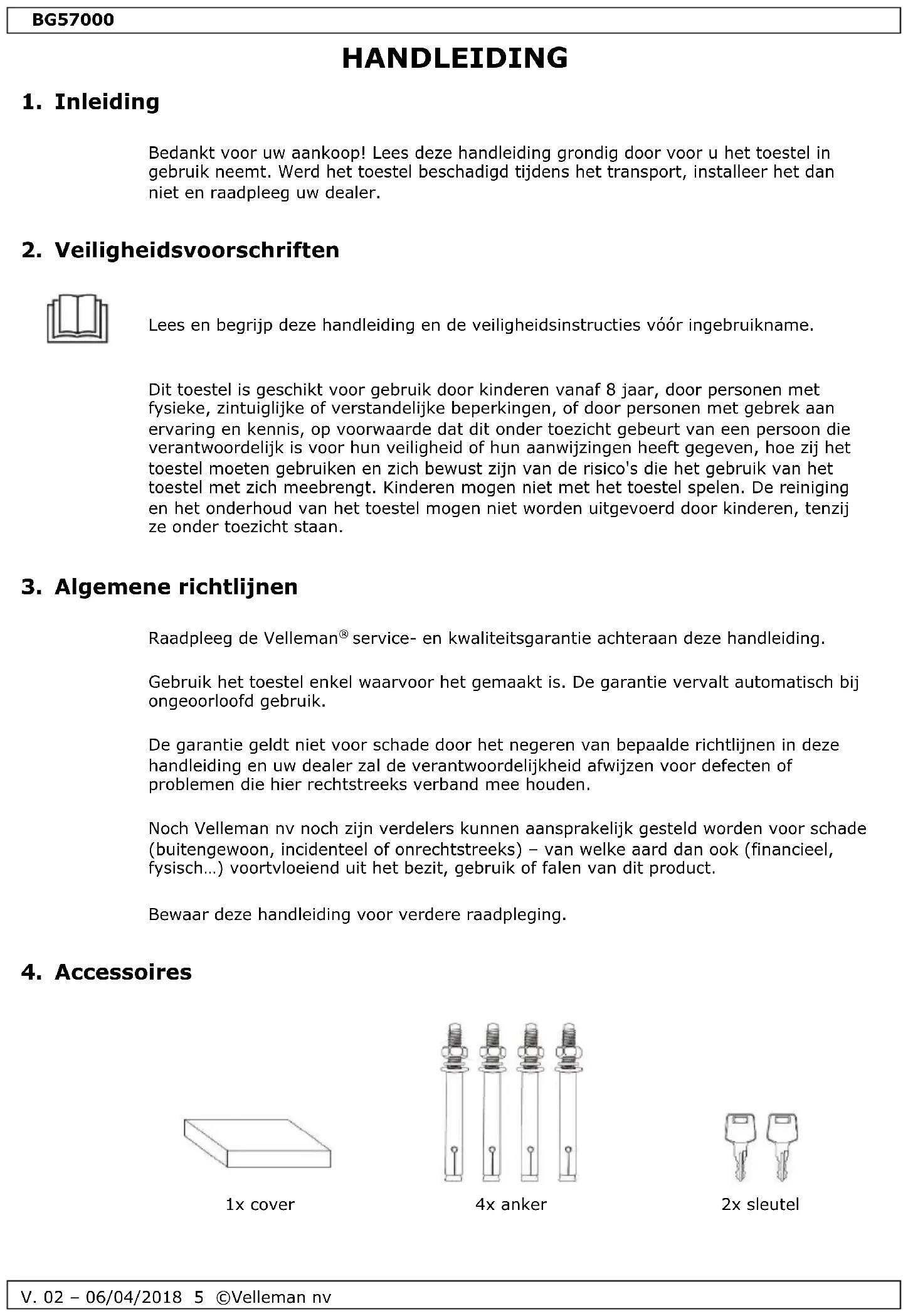 Velleman nv heeft het auteursrecht voor deze handleiding. Alle wereldwijde rechten voorbehouden. Het is niet toegestaan om deze handleiding of gedeelten ervan over te nemen, te kopiëren, te vertalen, te bewerken en op te slaan op een elektronisch medium zonder voorafgaande schriftelijke toestemming van de rechthebbende.BG57000
