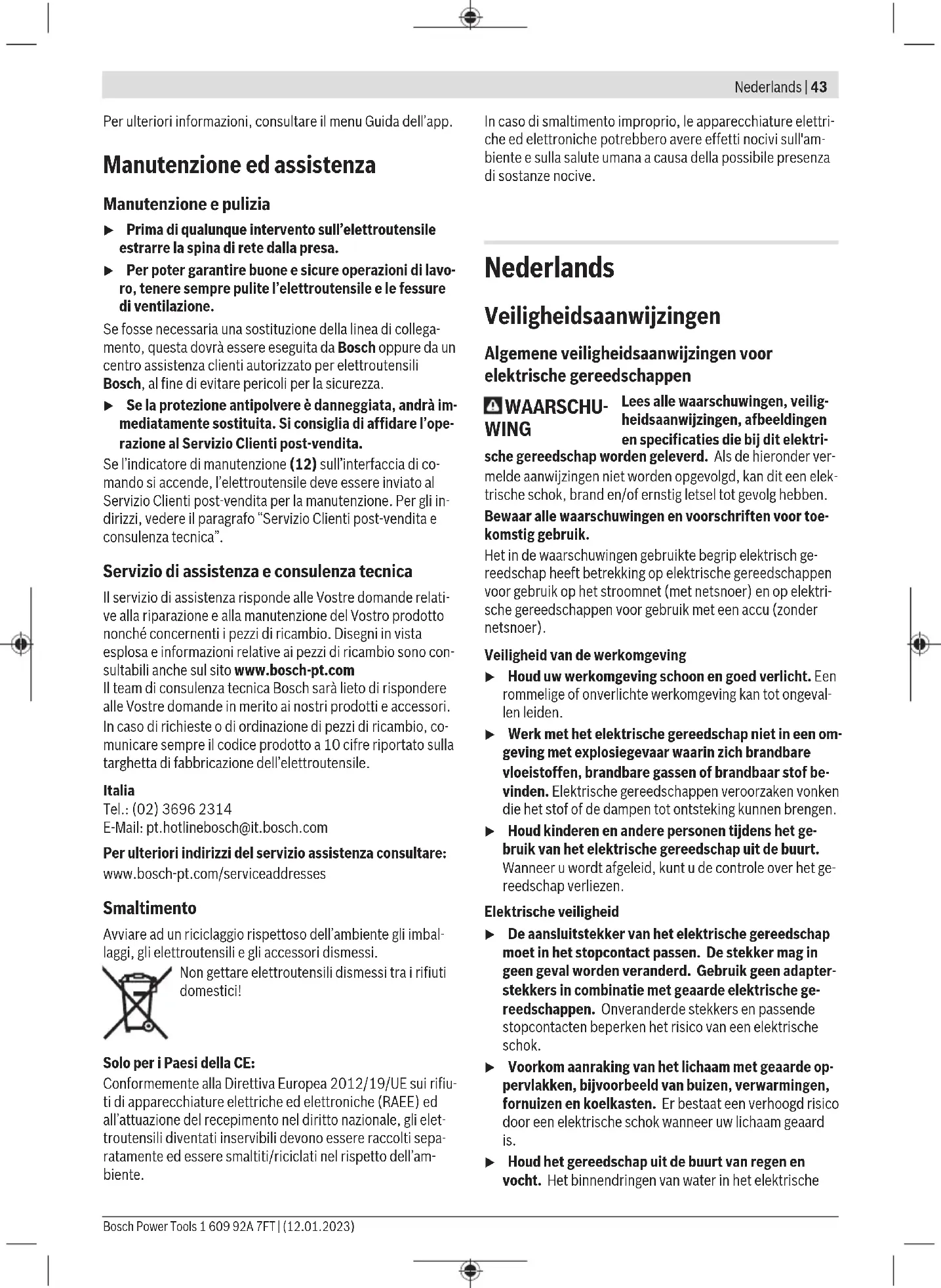 Low Energy Module GCY301‑42, per l’elettroutensile sono disponibili le se- guenti funzioni Connectivity: – Registrazione e personalizzazione – Controllo dello stato, emissione di messaggi di avverti- mento e di errore – Informazioni e impostazioni generali – Gestione 1 609 92A 7FT | (12.01.2023) Bosch Power ToolsNederlands | 43 Per ulteriori informazioni, consultare il menu Guida dell’app. Manutenzione ed assistenza Manutenzione e pulizia u Prima di qualunque intervento sull’elettroutensile estrarre la spina di rete dalla presa. u Per poter garantire buone e sicure operazioni di lavo- ro, tenere sempre pulite l’elettroutensile e le fessure di ventilazione. Se fosse necessaria una sostituzione della linea di collega- mento, questa dovrà essere eseguita da Bosch oppure da un centro assistenza clienti autorizzato per elettroutensili Bosch, al fine di evitare pericoli per la sicurezza. u Se la protezione antipolvere è danneggiata, andrà im- mediatamente sostituita. Si consiglia di affidare l’ope- razione al Servizio Clienti post-vendita. Se l’indicatore di manutenzione (12) sull’interfaccia di co- mando si accende, l’elettroutensile deve essere inviato al Servizio Clienti post-vendita per la manutenzione. Per gli in- dirizzi, vedere il paragrafo “Servizio Clienti post-vendita e consulenza tecnica”. Servizio di assistenza e consulenza tecnica Il servizio di assistenza risponde alle Vostre domande relati- ve alla riparazione e alla manutenzione del Vostro prodotto nonché concernenti i pezzi di ricambio. Disegni in vista esplosa e informazioni relative ai pezzi di ricambio sono con- sultabili anche sul sito www.bosch-pt.com Il team di consulenza tecnica Bosch sarà lieto di rispondere alle Vostre domande in merito ai nostri prodotti e accessori. In caso di richieste o di ordinazione di pezzi di ricambio, co- municare sempre il codice prodotto a 10cifre riportato sulla targhetta di fabbricazione dell’elettroutensile. Italia Tel.: (02) 3696 2314 E-Mail: pt.hotlinebosch@it.bosch.com Per ulteriori indirizzi del servizio assistenza consultare: www.bosch-pt.com/serviceaddresses Smaltimento Avviare ad un riciclaggio rispettoso dell’ambiente gli imbal- laggi, gli elettroutensili e gli accessori dismessi. Non gettare elettroutensili dismessi tra i rifiuti domestici! Solo per i Paesi dellaCE: Conformemente alla Direttiva Europea 2012/19/UE sui rifiu- ti di apparecchiature elettriche ed elettroniche (RAEE) ed all’attuazione del recepimento nel diritto nazionale, gli elet- troutensili diventati inservibili devono essere raccolti sepa- ratamente ed essere smaltiti/riciclati nel rispetto dell’am- biente. In caso di smaltimento improprio, le apparecchiature elettri- che ed elettroniche potrebbero avere effetti nocivi sull'am- biente e sulla salute umana a causa della possibile presenza di sostanze nocive. Nederlands Veiligheidsaanwijzingen Algemene veiligheidsaanwijzingen voor elektrische gereedschappen WAARSCHU- WING Lees alle waarschuwingen, veilig- heidsaanwijzingen, afbeeldingen en specificaties die bij dit elektri- sche gereedschap worden geleverd. Als de hieronder ver- melde aanwijzingen niet worden opgevolgd, kan dit een elek- trische schok, brand en/of ernstig letsel tot gevolg hebben. Bewaar alle waarschuwingen en voorschriften voor toe- komstig gebruik. Het in de waarschuwingen gebruikte begrip elektrisch ge- reedschap heeft betrekking op elektrische gereedschappen voor gebruik op het stroomnet (met netsnoer) en op elektri- sche gereedschappen voor gebruik met een accu (zonder netsnoer). Veiligheid van de werkomgeving u Houd uw werkomgeving schoon en goed verlicht. Een rommelige of onverlichte werkomgeving kan tot ongeval- len leiden. u Werk met het elektrische gereedschap niet in een om- geving met explosiegevaar waarin zich brandbare vloeistoffen, brandbare gassen of brandbaar stof be- vinden. Elektrische gereedschappen veroorzaken vonken die het stof of de dampen tot ontsteking kunnen brengen. u Houd kinderen en andere personen tijdens het ge- bruik van het elektrische gereedschap uit de buurt. Wanneer u wordt afgeleid, kunt u de controle over het ge- reedschap verliezen. Elektrische veiligheid u De aansluitstekker van het elektrische gereedschap moet in het stopcontact passen. De stekker mag in geen geval worden veranderd. Gebruik geen adapter- stekkers in combinatie met geaarde elektrische ge- reedschappen. Onveranderde stekkers en passende stopcontacten beperken het risico van een elektrische schok. u Voorkom aanraking van het lichaam met geaarde op- pervlakken, bijvoorbeeld van buizen, verwarmingen, fornuizen en koelkasten. Er bestaat een verhoogd risico door een elektrische schok wanneer uw lichaam geaard is. u Houd het gereedschap uit de buurt van regen en vocht. Het binnendringen van water in het elektrische Bosch Power Tools 1 609 92A 7FT | (12.01.2023)44 | Nederlands gereedschap vergroot het risico van een elektrische schok. u Gebruik de kabel niet voor een verkeerd doel, om het elektrische gereedschap te dragen of op te hangen of om de stekker uit het stopcontact te trekken. Houd de kabel uit de buurt van hitte, olie, scherpe randen of bewegende delen. Beschadigde of in de war geraakte kabels vergroten het risico van een elektrische schok. u Wanneer u buitenshuis met elektrisch gereedschap werkt, dient u alleen verlengkabels te gebruiken die voor gebruik buitenshuis zijn goedgekeurd. Het ge- bruik van een voor gebruik buitenshuis geschikte verleng- kabel beperkt het risico van een elektrische schok. u Als het gebruik van het elektrische gereedschap in een vochtige omgeving onvermijdelijk is, dient u een aardlekschakelaar te gebruiken. Het gebruik van een aardlekschakelaar vermindert het risico van een elektri- sche schok. Veiligheid van personen u Wees alert, let goed op wat u doet en ga met verstand te werk bij het gebruik van het elektrische gereed- schap. Gebruik geen elektrisch gereedschap, wan- neer u moe bent of onder invloed staat van dru