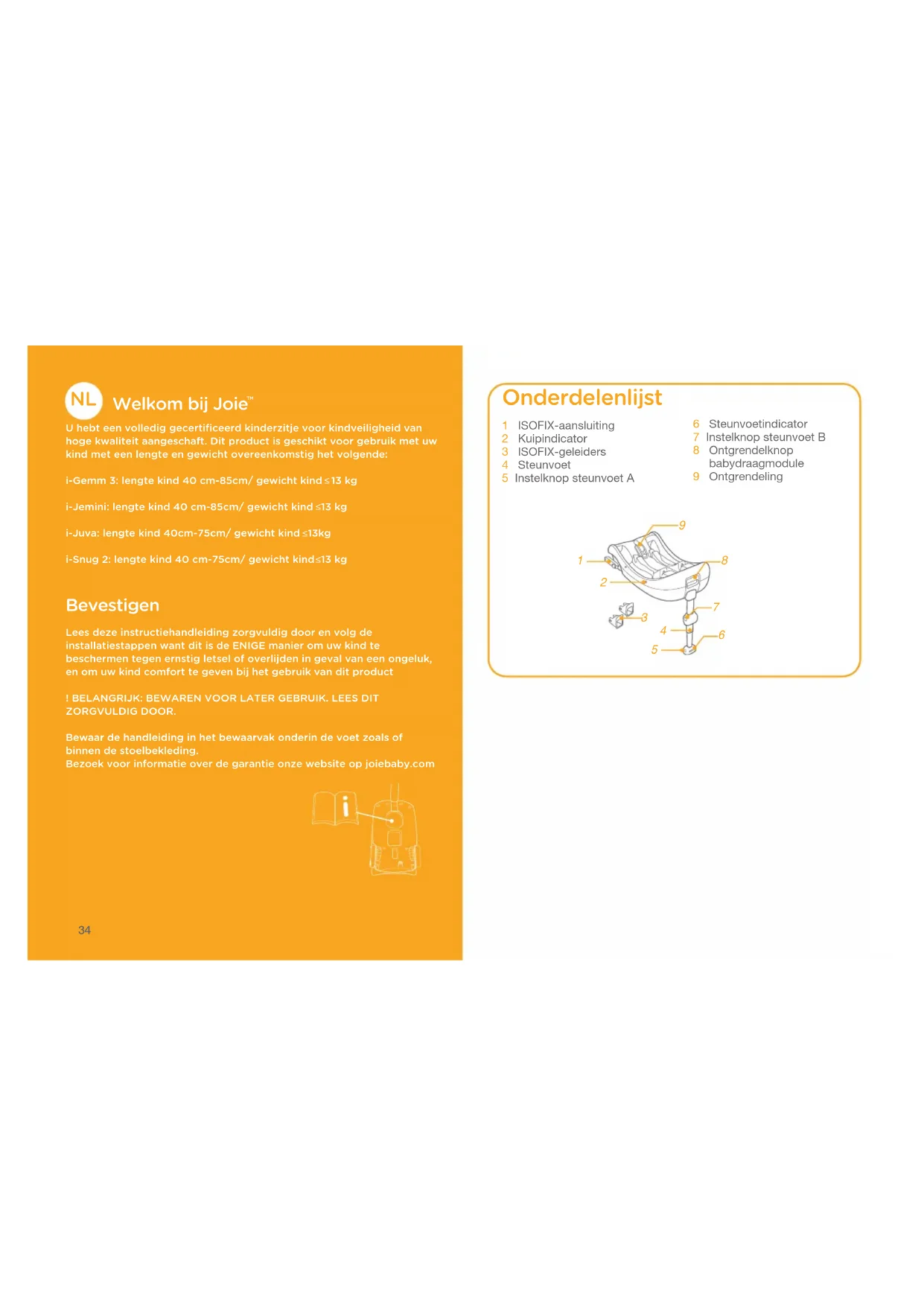 13kg i-Snug 2: lengte kind 40 cm-75cm/ gewicht kind 13 kg Bevestigen Lees deze instructiehandleiding zorgvuldig door en volg de installatiestappen want dit is de ENIGE manier om uw kind te beschermen tegen ernstig letsel of overlijden in geval van een ongeluk, en om uw kind comfort te geven bij het gebruik van dit product! BELANGRIJK: BEWAREN VOOR LATER GEBRUIK. LEES DIT ZORGVULDIG DOOR.Bewaar de handleiding in het bewaarvak onderin de voet zoals of binnen de stoelbekleding.Bezoek voor informatie over de garantie onze website op joiebaby.com 6 Steunvoetindicator 7 Instelknop steunvoet B 8 Ontgrendelknop babydraagmodule 9 Ontgrendeling