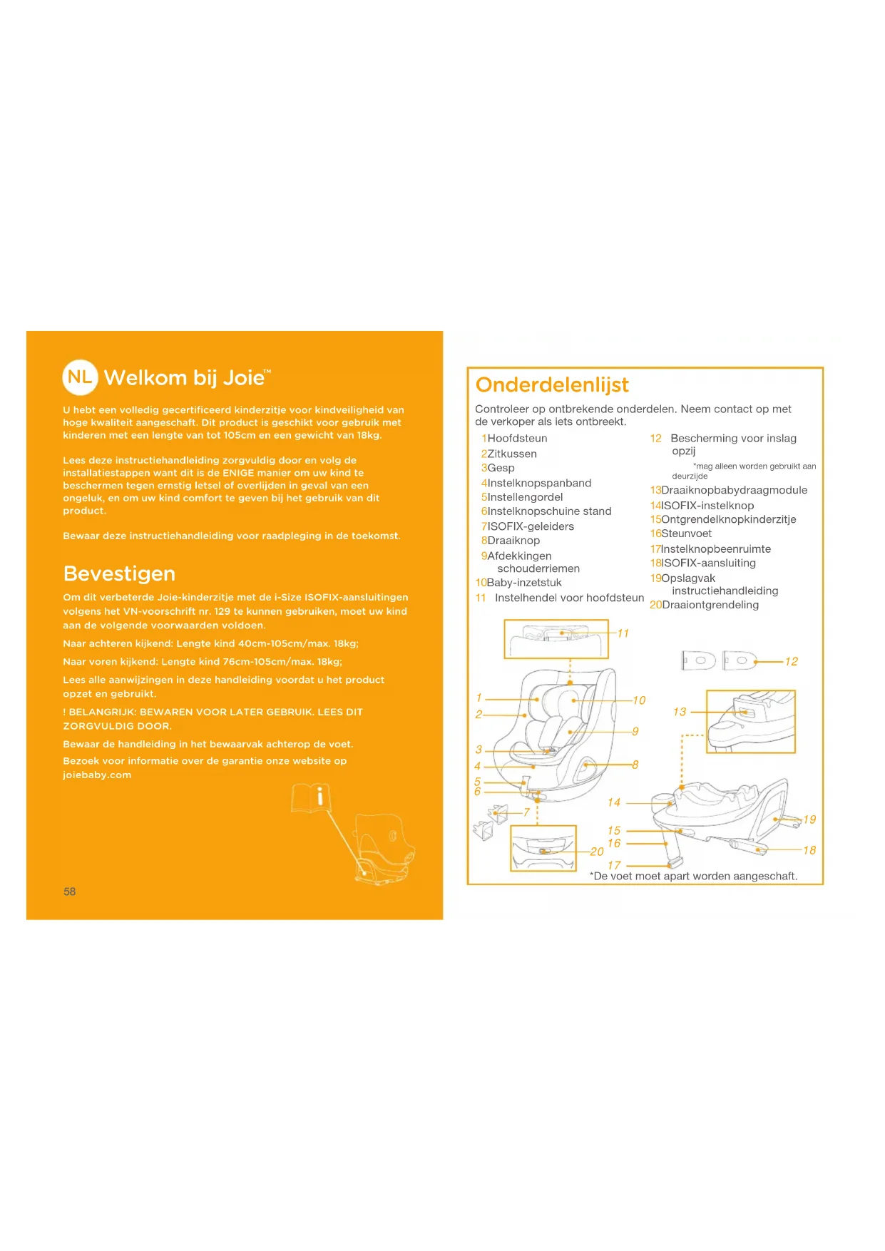 U hebt een volledig gecertificeerd kinderzitje voor kindveiligheid van hoge kwaliteit aangeschaft. Dit product is geschikt voor gebruik met kinderen met een lengte van tot 105cm en een gewicht van 18kg.Lees deze instructiehandleiding zorgvuldig door en volg de installatiestappen want dit is de ENIGE manier om uw kind te beschermen tegen ernstig letsel of overlijden in geval van een ongeluk﹐ en om uw kind comfort te geven bij het gebruik van dit product.Bewaar deze instructiehandleiding voor raadpleging in de toekomst. Bevestigen Om dit verbeterde Joie-kinderzitje met de i-Size ISOFIX-aansluitingen volgens het VN-voorschrift nr. 129 te kunnen gebruiken﹐ moet uw kind aan de volgende voorwaarden voldoen.Naar achteren kijkend: Lengte kind 40cm-105cm/max. 18kg;Naar voren kijkend: Lengte kind 76cm-105cm/max. 18kg;Lees alle aanwijzingen in deze handleiding voordat u het product opzet en gebruikt.! BELANGRIJK: BEWAREN VOOR LATER GEBRUIK. LEES DIT ZORGVULDIG DOOR.Bewaar de handleiding in het bewaarvak achterop de voet.Bezoek voor informatie over de garantie onze website op joiebaby.com Onderdelenlijst 1 Hoofdsteun 2 Zitkussen 3 Gesp 4 Instelknop spanband 5 Instellen gordel 6 Instelknop schuine stand 7 ISOFIX-geleiders 8 Draaiknop 9 Afdekkingen schouderriemen10 Baby-inzetstuk11 Instelhendel voor hoofdsteun12 Bescherming voor inslag opzij *mag alleen worden gebruikt aan deurzijde13 Draaiknop babydraagmodule14 ISOFIX-instelknop15 Ontgrendelknop kinderzitje16 Steunvoet17 Instelknop beenruimte18 ISOFIX-aansluiting19 Opslagvak instructiehandleiding20 DraaiontgrendelingControleer op ontbrekende onderdelen. Neem contact op met de verkoper als iets ontbreekt. *De voet moet apart worden aangeschaft.