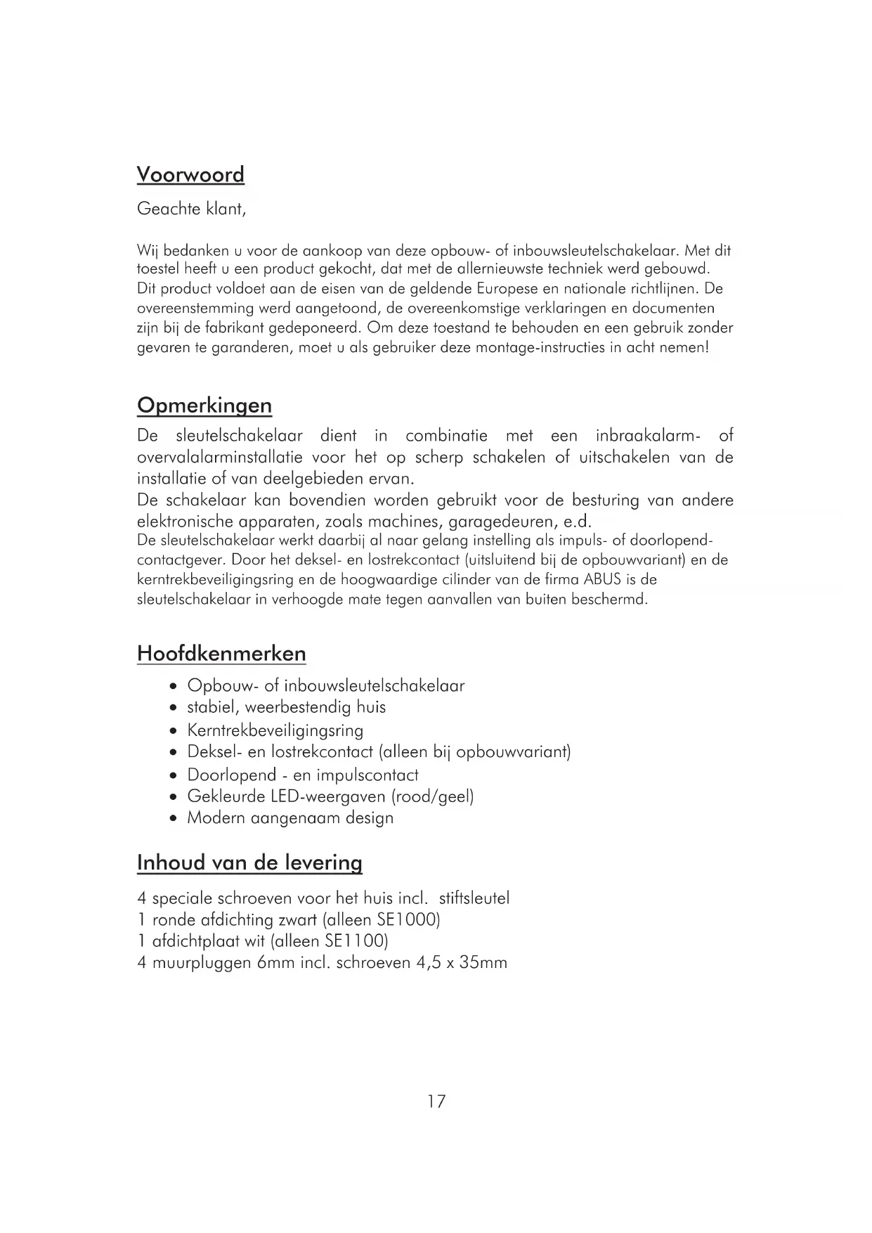 - SE1000 SE1100 Schlüsselschalter Installationsanleitung Voorwoord Geachte klant, Wij bedanken u voor de aankoop van deze opbouw- of inbouwsleutelschakelaar. Met dit toestel heeft u een product gekocht, dat met de allernieuwste techniek werd gebouwd. Dit product voldoet aan de eisen van de geldende Europese en nationale richtlijnen. De overeenstemming werd aangetoond, de overeenkomstige verklaringen en documenten zijn bij de fabrikant gedeponeerd. Om deze toestand te behouden en een gebruik zonder gevaren te garanderen, moet u als gebruiker deze montage-instructies in acht nemen! Opmerkingen De sleutelschakelaar dient in combinatie met een inbraakalarm- of overvalalarminstallatie voor het op scherp schakelen of uitschakelen van de installatie of van deelgebieden ervan. De schakelaar kan bovendien worden gebruikt voor de besturing van andere elektronische apparaten, zoals machines, garagedeuren, e.d. De sleutelschakelaar werkt daarbij al naar gelang instelling als impuls- of doorlopend- contactgever. Door het deksel- en lostrekcontact (uitsluitend bij de opbouwvariant) en de kerntrekbeveiligingsring en de hoogwaardige cilinder van de firma ABUS is de sleutelschakelaar in verhoogde mate tegen aanvallen van buiten beschermd. Hoofdkenmerken x Opbouw- of inbouwsleutelschakelaar x stabiel, weerbestendig huis x Kerntrekbeveiligingsring x Deksel- en lostrekcontact (alleen bij opbouwvariant) x Doorlopend - en impulscontact x Gekleurde LED-weergaven (rood/geel) x Modern aangenaam design Inhoud van de levering 4 speciale schroeven voor het huis incl. stiftsleutel 1 ronde afdichting zwart (alleen SE1000) 1 afdichtplaat wit (alleen SE1100) 4 muurpluggen 6mm incl. schroeven 4,5 x 35mm18 Beschrijving p. 117