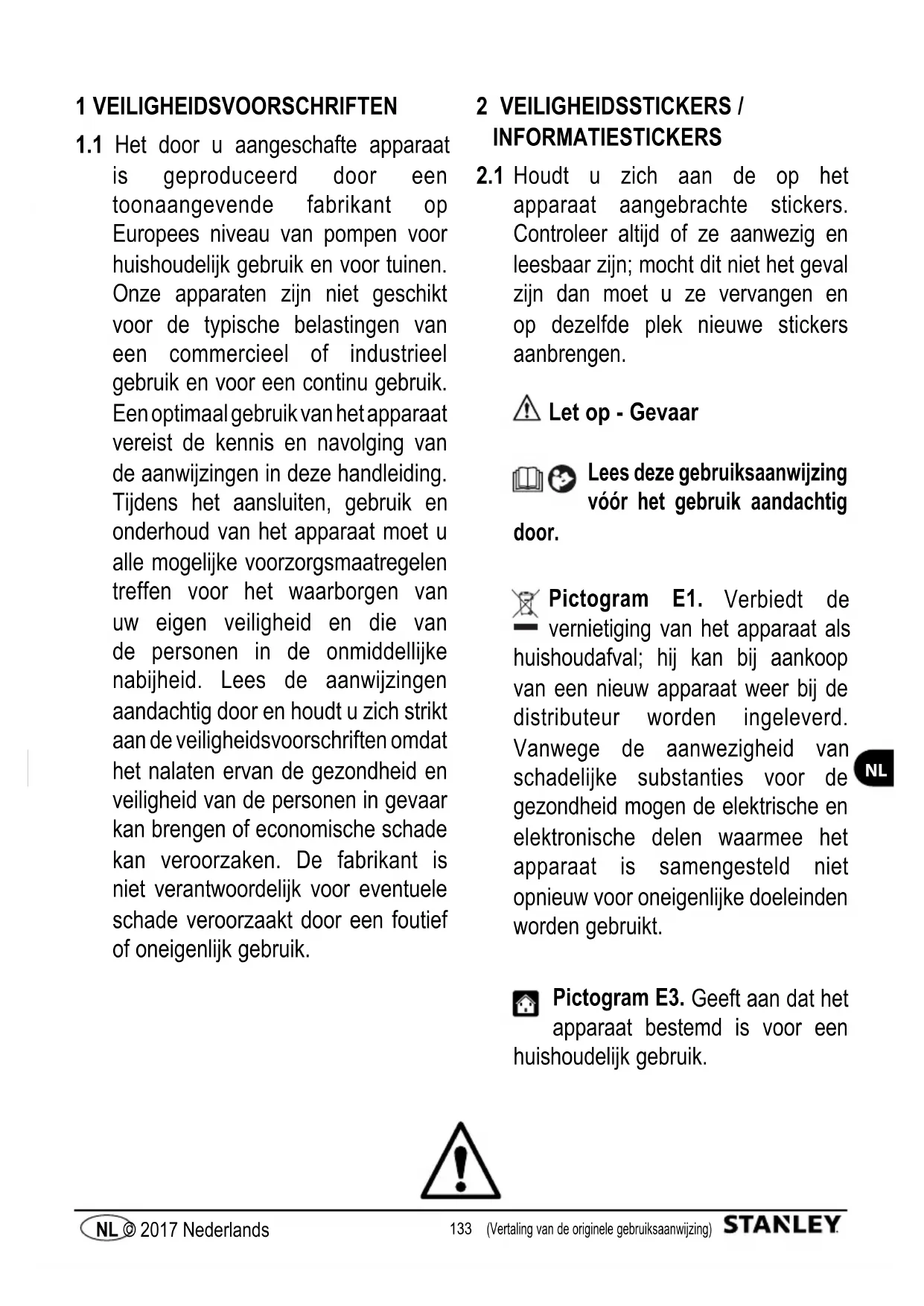 Houdt u zich aan de op het apparaat aangebrachte stickers. Controleer altijd of ze aanwezig en leesbaar zijn; mocht dit niet het geval zijn dan moet u ze vervangen en op dezelfde plek nieuwe stickers aanbrengen. Let op - Gevaar Lees deze gebruiksaanwijzing vóór het gebruik aandachtig door. Pictogram E1. Verbiedt de vernietiging van het apparaat als huishoudafval; hij kan bij aankoop van een nieuw apparaat weer bij de distributeur worden ingeleverd. Vanwege de aanwezigheid van schadelijke substanties voor de gezondheid mogen de elektrische en elektronische delen waarmee het apparaat is samengesteld niet opnieuw voor oneigenlijke doeleinden worden gebruikt. Pictogram E3. Geeft aan dat het apparaat bestemd is voor een huishoudelijk gebruik.134 (Vertaling van de originele gebruiksaanwijzing) NL © 2017 Nederlands