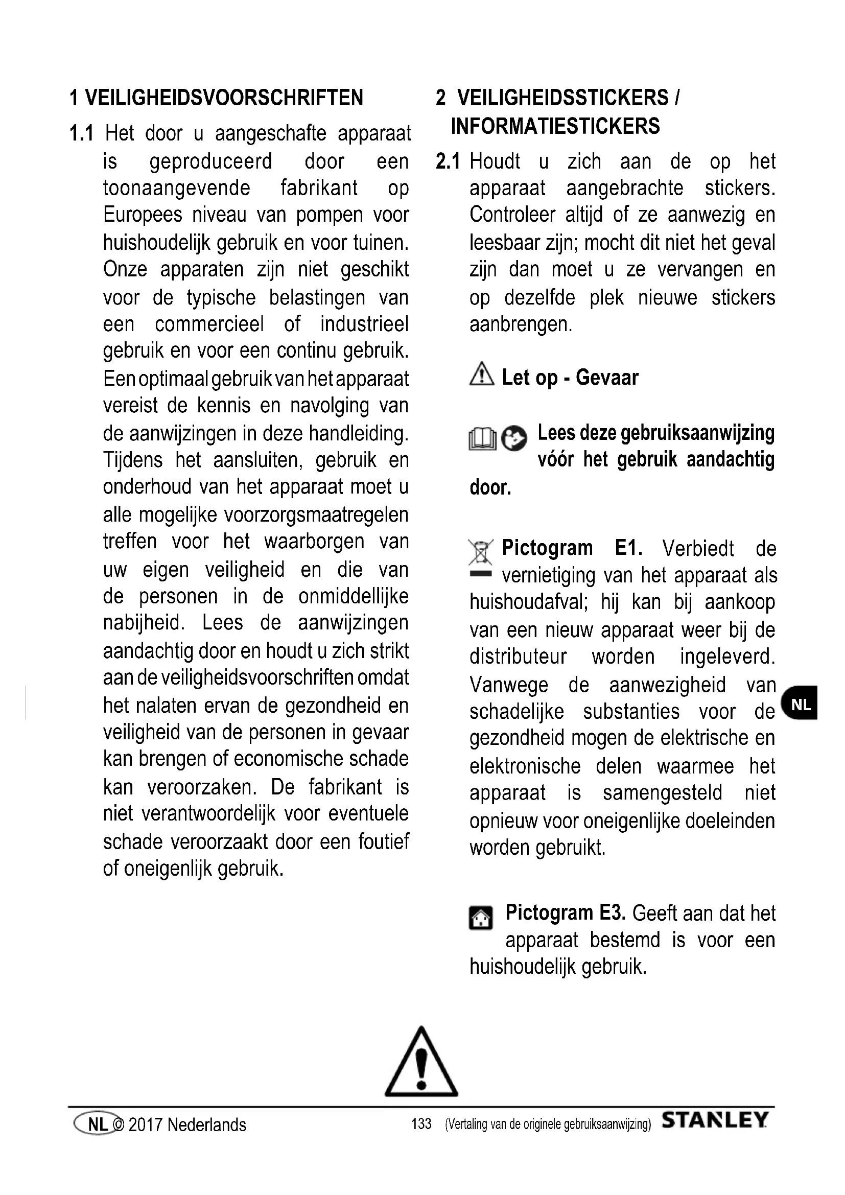 Houdt u zich aan de op het apparaat aangebrachte stickers. Controleer altijd of ze aanwezig en leesbaar zijn; mocht dit niet het geval zijn dan moet u ze vervangen en op dezelfde plek nieuwe stickers aanbrengen. Let op - Gevaar Lees deze gebruiksaanwijzing vóór het gebruik aandachtig door. Pictogram E1. Verbiedt de vernietiging van het apparaat als huishoudafval; hij kan bij aankoop van een nieuw apparaat weer bij de distributeur worden ingeleverd. Vanwege de aanwezigheid van schadelijke substanties voor de gezondheid mogen de elektrische en elektronische delen waarmee het apparaat is samengesteld niet opnieuw voor oneigenlijke doeleinden worden gebruikt. Pictogram E3. Geeft aan dat het apparaat bestemd is voor een huishoudelijk gebruik.134 (Vertaling van de originele gebruiksaanwijzing) NL © 2017 Nederlands