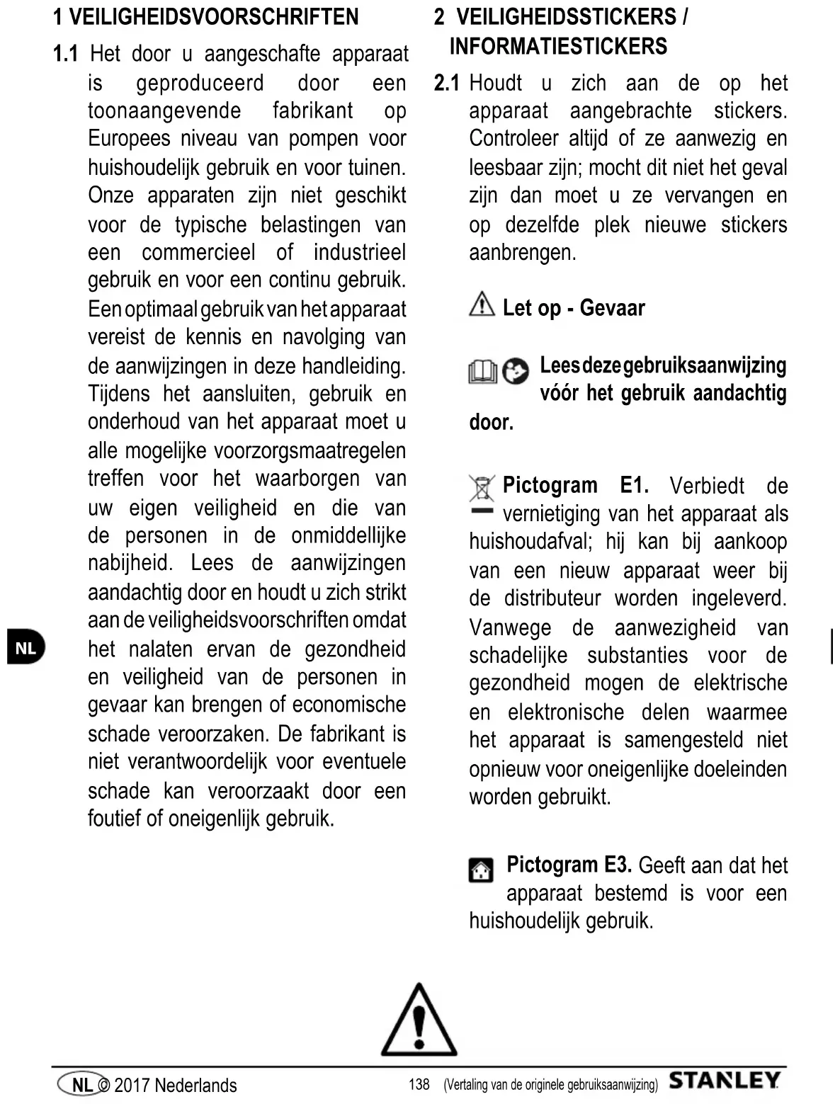 Houdt u zich aan de op het apparaat aangebrachte stickers. Controleer altijd of ze aanwezig en leesbaar zijn; mocht dit niet het geval zijn dan moet u ze vervangen en op dezelfde plek nieuwe stickers aanbrengen. Let op - Gevaar Lees deze gebruiksaanwijzing vóór het gebruik aandachtig door. Pictogram E1. Verbiedt de vernietiging van het apparaat als huishoudafval; hij kan bij aankoop van een nieuw apparaat weer bij de distributeur worden ingeleverd. Vanwege de aanwezigheid van schadelijke substanties voor de gezondheid mogen de elektrische en elektronische delen waarmee het apparaat is samengesteld niet opnieuw voor oneigenlijke doeleinden worden gebruikt. Pictogram E3. Geeft aan dat het apparaat bestemd is voor een huishoudelijk gebruik.139 (Vertaling van de originele gebruiksaanwijzing) NL © 2017 Nederlands