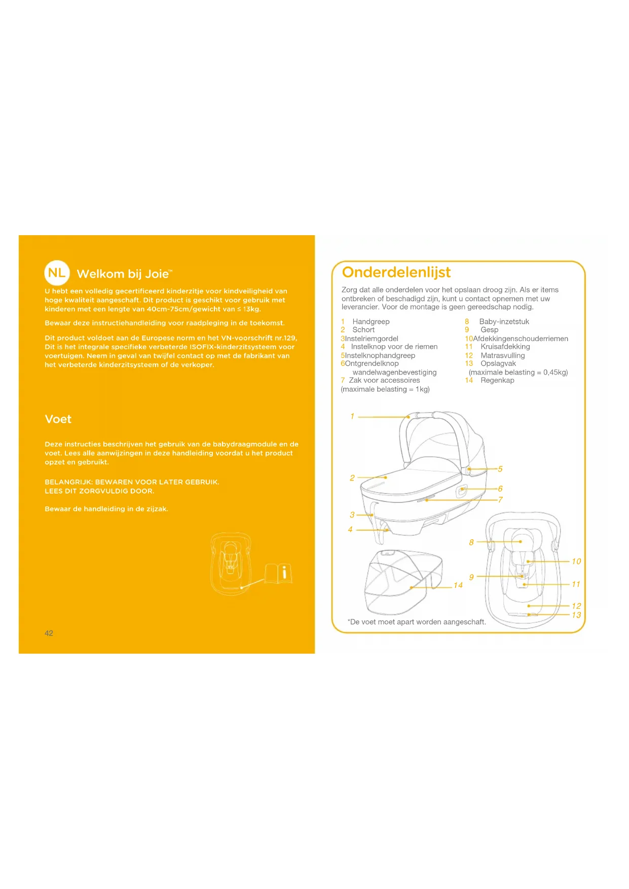U hebt een volledig gecertificeerd kinderzitje voor kindveiligheid van hoge kwaliteit aangeschaft. Dit product is geschikt voor gebruik met kinderen met een lengte van 40cm-75cm/gewicht van ≤ 13kg.Bewaar deze instructiehandleiding voor raadpleging in de toekomst.Dit product voldoet aan de Europese norm en het VN-voorschrift nr.129, Dit is het integrale specifieke verbeterde ISOFIX-kinderzitsysteem voor voertuigen. Neem in geval van twijfel contact op met de fabrikant van het verbeterde kinderzitsysteem of de verkoper. Voet Deze instructies beschrijven het gebruik van de babydraagmodule en de voet. Lees alle aanwijzingen in deze handleiding voordat u het product opzet en gebruikt.BELANGRIJK: BEWAREN VOOR LATER GEBRUIK.LEES DIT ZORGVULDIG DOOR.Bewaar de handleiding in de zijzak.Zorg dat alle onderdelen voor het opslaan droog zijn. Als er items ontbreken of beschadigd zijn, kunt u contact opnemen met uw leverancier. Voor de montage is geen gereedschap nodig. 1 Handgreep 2 Schort 3 Instelriem gordel 4 Instelknop voor de riemen 5 Instelknop handgreep 6 Ontgrendelknop wandelwagenbevestiging 7 Zak voor accessoires (maximale belasting = 1kg) Onderdelenlijst 8 Baby-inzetstuk9 Gesp10 Afdekkingen schouderriemen11 Kruisafdekking12 Matrasvulling13 Opslagvak (maximale belasting = 0,45kg)14 Regenkap