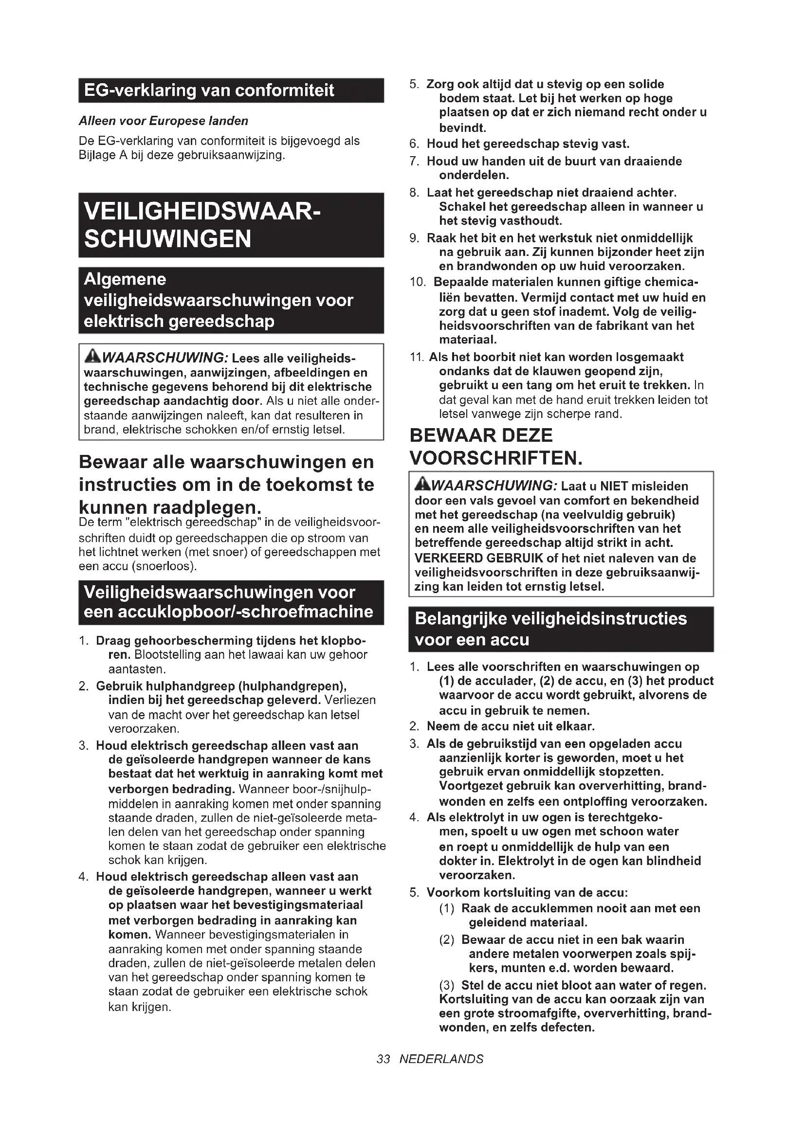 schap is uitgeschakeld en stationair draait, naast de 33 NEDERLANDS EG-verklaring van conformiteit Alleen voor Europese landen #&J ;%J VEILIGHEIDSWAAR- SCHUWINGEN Algemene veiligheidswaarschuwingen voor elektrisch gereedschap WAARSCHUWING: Lees alle veiligheids- waarschuwingen, aanwijzingen, afbeeldingen en technische gegevens behorend bij dit elektrische gereedschap aandachtig door.%-