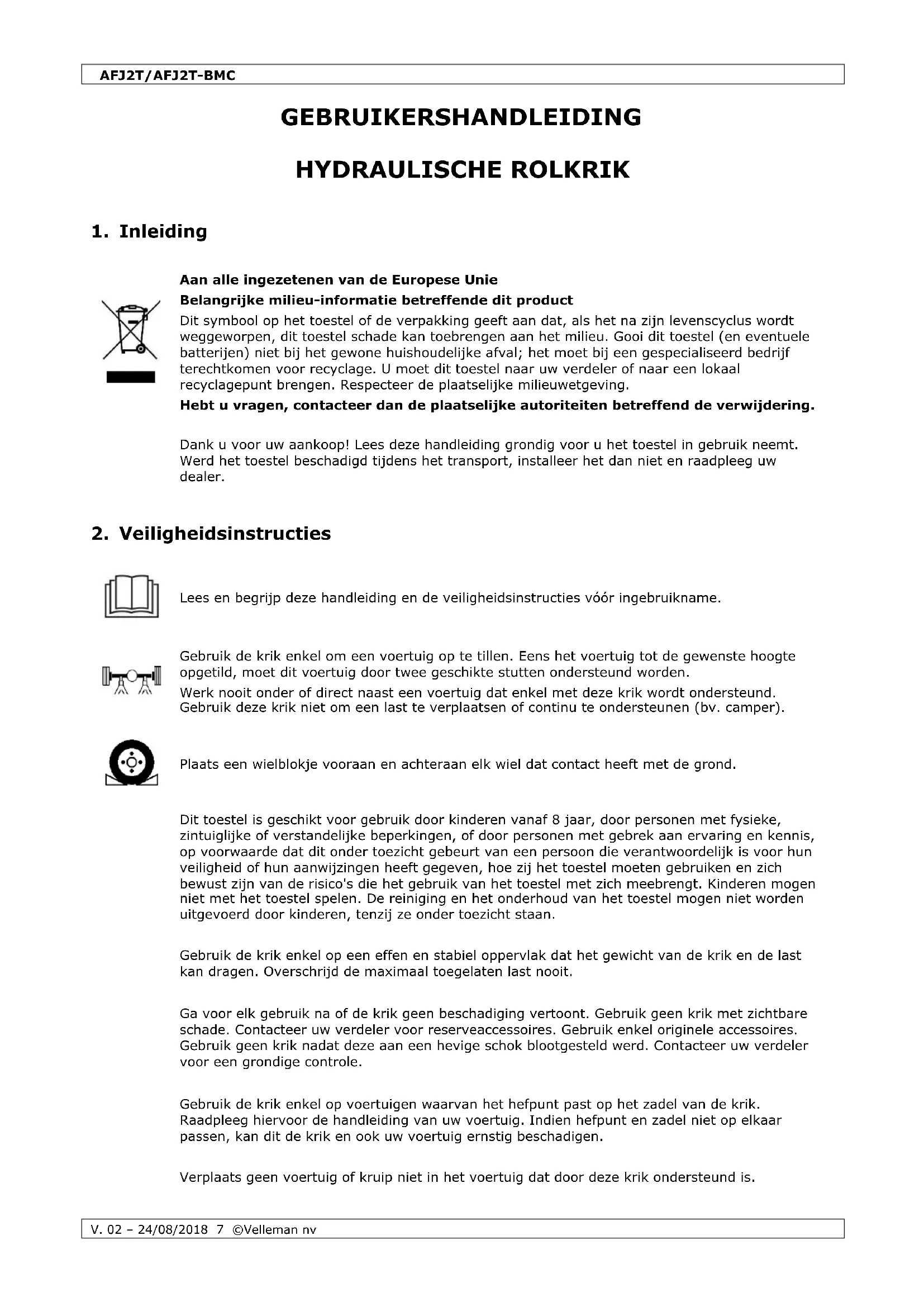Velleman nv heeft het auteursrecht voor deze handleiding. Alle wereldwijde rechten voorbehouden. Het is niet toegestaan om deze handleiding of gedeelten ervan over te nemen, te kopiëren, te vertalen, te bewerken en op te slaan op een elektronisch medium zonder voorafgaande schriftelijke toestemming van de rechthebbende.AFJ2T/AFJ2T-BMC