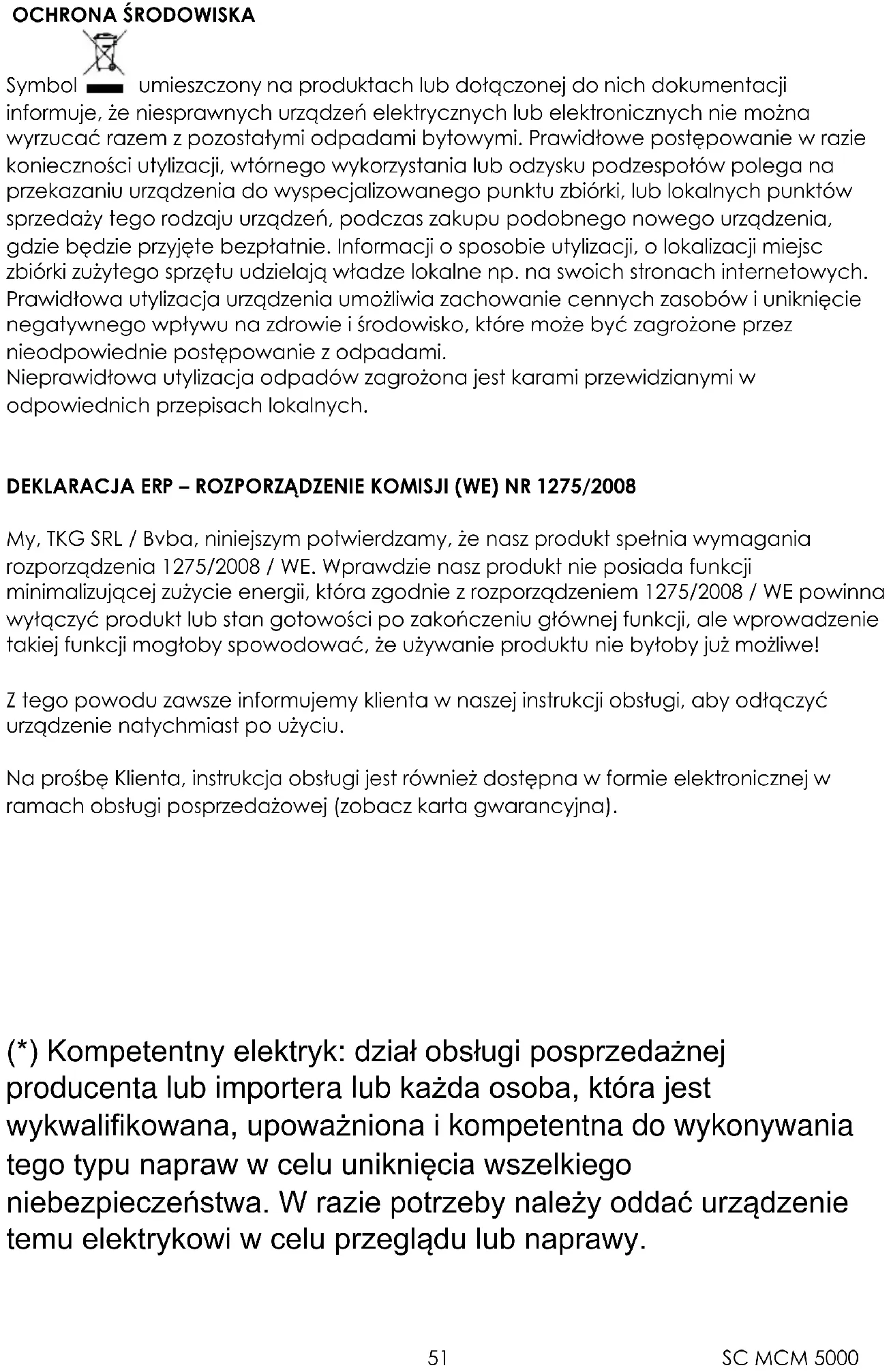 Wij, TKG SRL/Bvba, bevestigen hierbij dat ons product voldoet aan de vereisten van Verordening 1275/2008 / EG. Toegegeven, ons product beschikt niet over een functie om het stroomverbruik te minimaliseren, wat volgens verordening 1275/2008 / EG het product in de uitstand of de standby-modus zou moeten zetten na het beëindigen van de hoofdfunctie, maar dit is praktisch onmogelijk omdat het een compromis zou vormen de belangrijkste functie van het product zo sterk, dat het gebruik van het product niet langer mogelijk zou zijn! Om deze reden vertellen we de klant altijd in onze handleiding om het apparaat onmiddellijk na gebruik los te koppelen. De handleiding is op simpele aanvraag ook verkrijgbaar in elektronisch formaat bij de klantendienst (zie garantiekaart).61 SC MCM 5000
