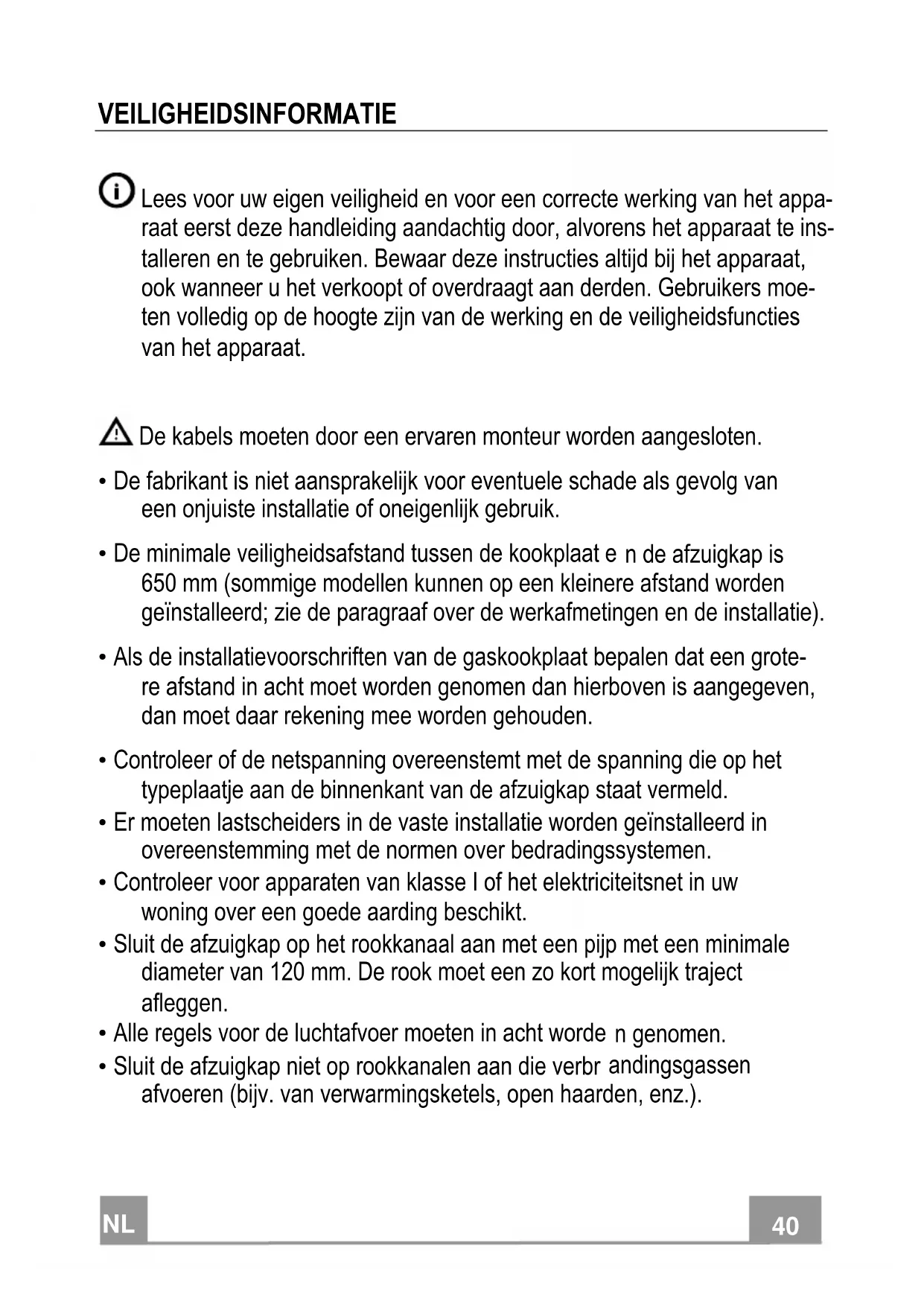 - Sluit de afzuigkap niet op rookkanalen aan die verbr andingsgassen afvoeren (bijv. van verwarmingsketels, open haarden, enz.).NL