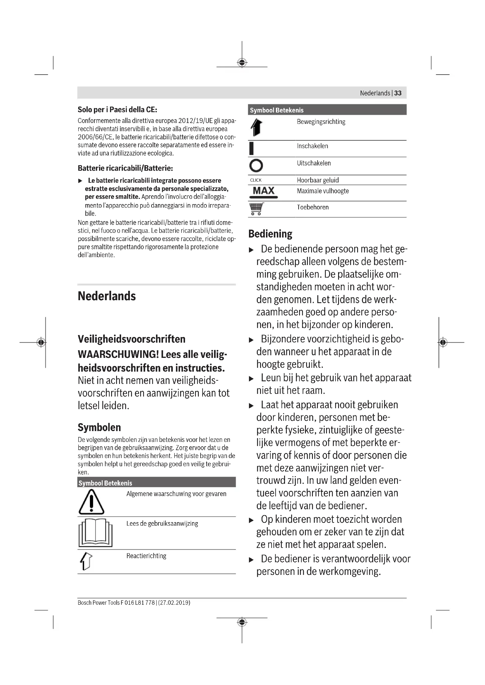 varia secondo il Paese Montaggio ed uso Scopo dell’operazione Figura Pagina Componenti illustrati A 157 Volume di fornitura B 158 Ricarica della batteria C 159 Montaggio/smontaggio della testa di aspirazione grande/piccola D 159 Riempimento dell'applicatore a spruzzo Montaggio della testa applicatore a spruzzo E 160 Applicazione del panno in microfi- bra 110 mm F 160 Scopo dell’operazione Figura Pagina Montaggio della testa applicatore a spruzzo 276 mm Applicazione del panno in microfi- bra 276 mm Smontaggio della testa applicatore a spruzzo G 161 Impiego H - I 162 – 164 Svuotamento del serbatoio dell'ac- qua sporca I 164 Pulizia dell'apparecchio J - K 164 – 165 Rimozione del panno in microfibra 110 mm Pulizia del panno in microfibra L 166 Accessori M 166 Messa in funzione Nota: La batteria ricaricabile viene fornita parzialmente cari- ca. Per garantire l’intera potenza della batteria ricaricabile, prima del primo impiego ricaricare completamente la batte- ria ricaricabile nella stazione di ricarica. La batteria ricaricabile può essere ricaricata in qualsiasi mo- mento senza ridurne la durata. Un’interruzione dell’operazio- ne di ricarica non danneggia la batteria ricaricabile. La batteria ricaricabile è protetta contro lo scaricamento completo. L'apparecchio si ferma se la batteria ricaricabile è scarica. Ricarica della batteria (vedi figura A e C) Nota: La micro presa USB (20) per il collegamento del micro cavo USB (17) è situata nell'impugnatura. Se la ricarica della batteria è bassa l'indicatore dello stato di carica della batteria (4) lampeggia verde. La batteria ricaricabile deve essere ricaricata se l'indicatore dello stato di carica della batteria (4) lampeggia rosso. Spe- gnere l'apparecchio e ricaricare la batteria. Collegare l'apparecchio tramite il micro cavo USB (17) alla stazione di ricarica (18). Collegare la stazione di ricarica (18) alla presa. L'operazione di ricarica avrà inizio. Durante l'operazione di ricarica l'impugnatura dell'apparec- chio si riscalda. Questo è normale. L'indicatore dello stato di carica della batteria (4) è illumina- to permanentemente rosso durante l'operazione di ricarica. Quando la batteria è completamente carica l'indicatore dello stato di ricarica della batteria (4)è illuminato permanente- mente verde. Quando l'operazione di ricarica è terminata staccare la sta- zione di ricarica dalla rete elettrica. Si prega di attenersi alle indicazioni relative allo smaltimen- to. Bosch Power Tools F 016 L81 778 | (27.02.2019)32 | Italiano Individuazione dei guasti e rimedi Problema Possibili cause Rimedi L'apparecchio non si avvia Batteria scarica Ricaricare la batteria Batteria ricaricabile troppo fredda/troppo calda Lasciare riscaldare/raffreddare la batteria Potenza di aspirazione limitata o assente Testa di aspirazione bloccata Eliminare il bloccaggio nella testa di aspirazione Chiusura assente Sostituire la chiusura L’apparecchio si spe- gne Batteria ricaricabile troppo fredda/troppo calda Lasciare riscaldare/raffreddare la batteria Testa di aspirazione bloccata Eliminare il bloccaggio nella testa di aspirazione Acqua fuoriesce dall'apparecchio Applicatore a spruzzo montato non correttamente Montare correttamente l'applicatore a spruzzo Batteria ricaricabile non si ricarica Stazione di ricarica non collegata correttamente Controllare la stazione di ricarica e i collegamenti del cavo USB Batteria ricaricabile troppo fredda/troppo calda Lasciare riscaldare/raffreddare la batteria Strisce sulla finestra Tergivetro danneggiato Sostituire il tergivetro (accessorio) Impiegata troppa forza Impiegare meno forza Impiegata troppa poca forza Impiegare più forza Manutenzione e pulizia (vedi figura J−K) Dopo l'impiego pulire sempre accuratamente l'apparecchio. Rimuovere la testa di aspirazione dal corpo principale e sciacquarla. Mentre la testa di aspirazione (2) viene rimossa dall'appa- recchio, riempire il serbatoio dell'acqua sporca (7) con ac- qua pulita e calda attraverso l'apertura della testa di aspira- zione fino alla linea Max. NON riempire il serbatoio dell'acqua sporca (7) attraverso l'apertura di scarico. Scuotere l'appa- recchio ed eliminare l'acqua attraverso la chiusura (8). Cura della testa di aspirazione Durante il magazzinaggio proteggere da danneggiamenti la testa di aspirazione. Evitare che carta o cartone tocchino il tergivetro, da questo contatto la plastica può venire danneggiata. Possono essere visibili sulla plastica macchie e linee. Questo è normale e non ha alcuna influenza sulla prestazione di pulizia. Tessili Panni in microfibra: 67% Poliestere, 14% Poliammide, 19% Polipropilene Servizio di assistenza e consulenza tecnica www.bosch-pt.de In caso di richieste o di ordinazione di pezzi di ricambio, co- municare sempre il codice prodotto a 10cifre riportato sulla targhetta di identificazione del prodotto. Italia Tel.: (02) 3696 2314 E-Mail: pt.hotlinebosch@it.bosch.com Svizzera Sul sito www.bosch-pt.com/ch/it è possible ordinare diret- tamente on-line i ricambi. Tel.: (044) 8471513 Fax: (044) 8471553 E-Mail: Aftersales.Service@de.bosch.com Trasporto Le batterie al litio contenute sono soggette ai requisiti di leg- ge relativi a merci pericolose. Le batterie possono essere trasportate su strada tramite l’utente senza ulteriori precau- zioni. In caso di spedizione tramite terzi (ad es. per via aerea o tra- mite spedizioniere), andranno rispettati specifici requisiti relativi d’imballaggio e contrassegnatura. In tale caso, per la preparazione dell’articolo da spedire, andrà consultato uno specialista in merci pericolose. Inviare le batterie soltanto se la relativa carcassa non è dan- neggiata. Coprire con nastro adesivo i contatti scoperti ed imballare la batteria in modo che non possa spostarsi nell’imballaggio. Andranno altresì rispettate eventuali ulte- riori norme nazionali complementari. Smaltimento Avviare ad un riciclaggio rispettoso dell’am- biente apparecchio, accessori ed imballaggi 