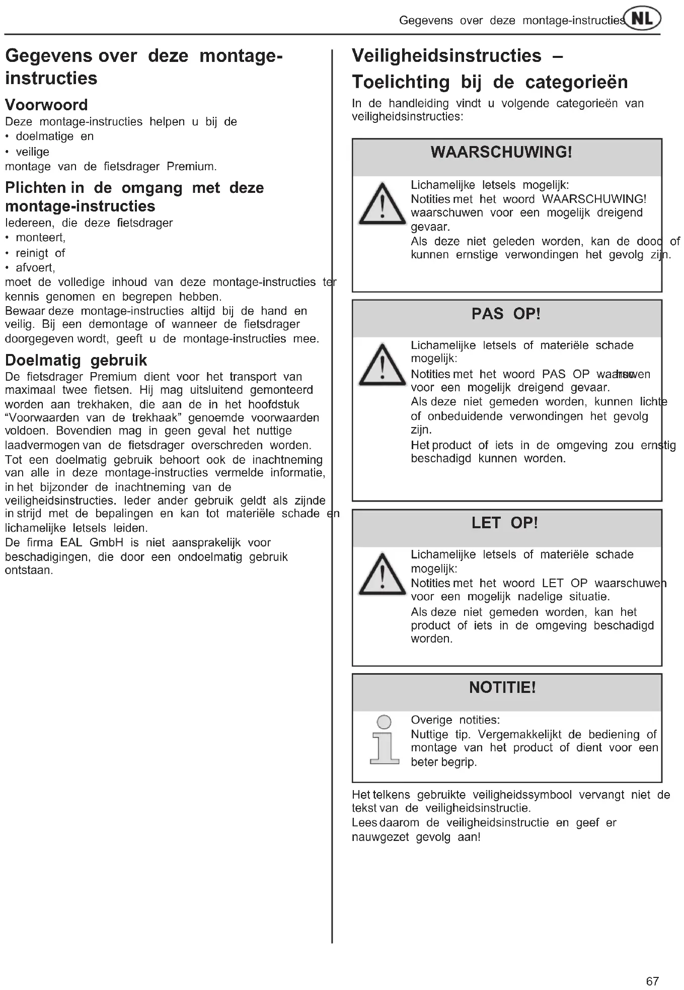 - Klap de fietsdrager vóór het openen van de achterklep neer.77 Demontage van de fietshouder Los eerst de vergrendelbout achter de kentekenplaathouder. Bij het verwijderen van de fietsdrager gaat u vervolgens in omgekeerde volgorde van de montage te werk. Reiniging en verzorging De fietsdrager kan met een mild reinigingsmiddel, met warm water en/of een zacht doekje gereinigd worden. Verwijder vooraf grof vuil en stof. Gebruik geen oplosmiddelen of gelijkaardige reinigingsmiddelen omdat deze de fietsdrager kunnen beschadigen. Laat de fietsdrager vanzelf drogen. Gebruik geen haardroger of andere verwarmingstoestellen om het droogproces te bespoedigen. Reinig de fietsdrager regelmatig in kustgebieden en wanneer er van winterse omstandigheden sprake is en dit om zout af te spoelen en om de houdbaarheid van de fietsdrager te verlengen. Bewaar de fiets drager tijdens langere perioden zonder gebruik (bijvoorbeeld in de winter) droog en beschermd om de levensduur te verlengen. Demontage / reiniging Dragen van de fietsdrager zonder transporttas Opbergen van de fietsdrager in de transporttas78 Afvalverwijdering Voor de afvalverwijdering dienen de lokale officiële voorschriften in acht genomen te worden. Deponeer ook de verpakking correct in de daarvoor bestemde verzamelbakken. Bijkomende informatie verkrijgt u op uw gemeentelijk opslagterrein. Contact EAL GmbH Otto-Hausmann-Ring 107 42115 Wuppertal GERMANY Telefoon. +49 (0) 202 - 429283-0 Telefax: +49 (0) 202 - 429283-160 E-mail: info@eal-vertrieb.com Onderhoud Controleer telkens vóór een rit de fietsdrager op slijtage. In het bijzonder moeten metalen onderdelen en spanriemen uitgewisseld worden. Gelieve u voor de uitwisseling van de onderdelen tot onze klantenservice te richten. Eender welke wijziging aan originele onderdelen en materialen of aan de constructie van de fietsdrager kan de veiligheid en het prestatievermogen in negatieve zin beïnvloeden. De stalen onderdelen van de fietsdrager werden in de fabriek door een poederlakcoating tegen corrosie beschermd. Als deze laklaag beschadigd is, zorgt u zo snel mogelijk voor een professionele oplossing van de