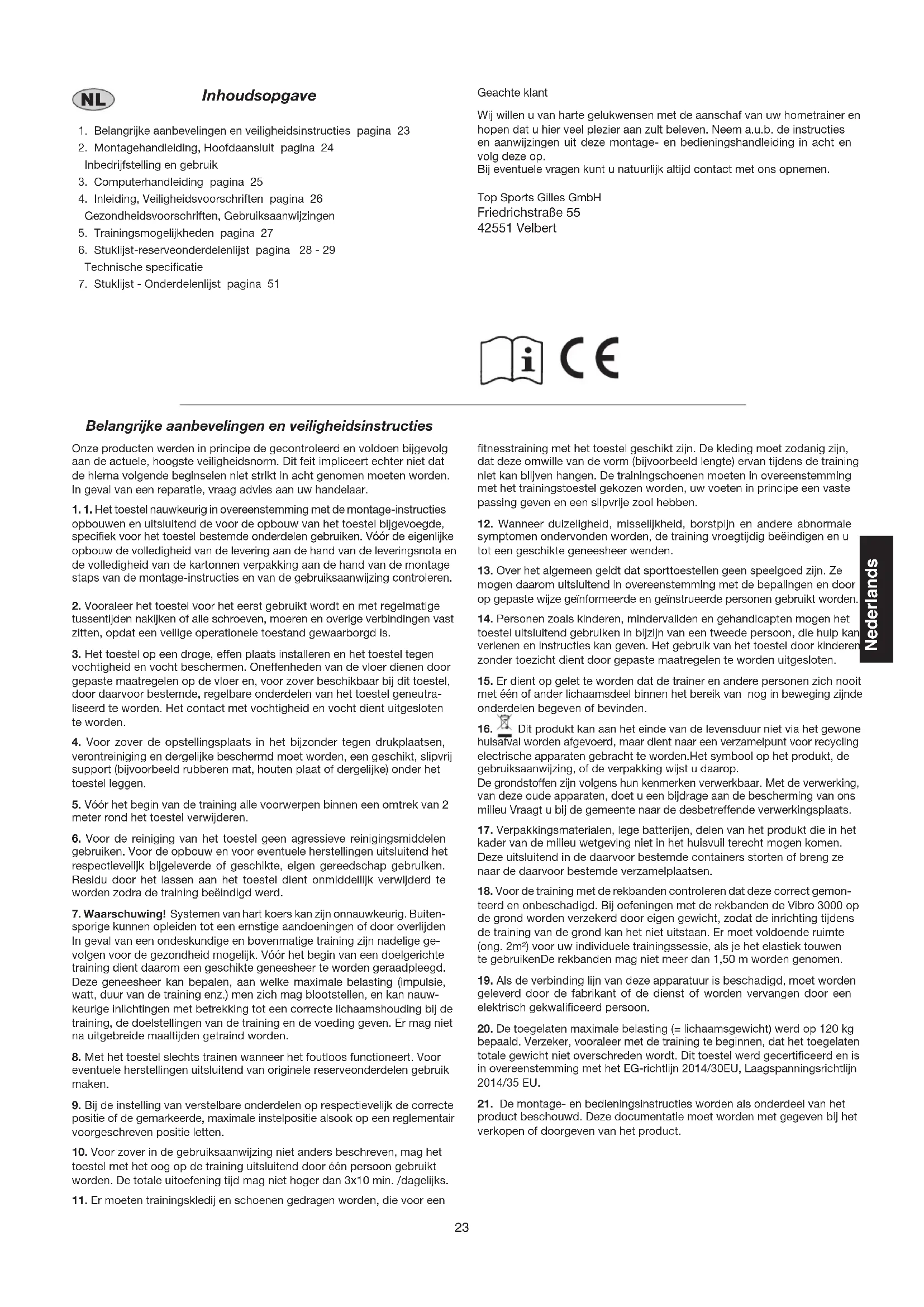 product beschouwd. Deze documentatie moet worden met gegeven bij het verkopen of doorgeven van het product. Geachte klant Wij willen u van harte gelukwensen met de aanschaf van uw hometrainer en hopen dat u hier veel plezier aan zult beleven. Neem a.u.b. de instructies en aanwijzingen uit deze montage- en bedieningshandleiding in acht en volg deze op. Bij eventuele vragen kunt u natuurlijk altijd contact met ons opnemen. Top Sports Gilles GmbH Friedrichstraße 55 42551 Velbert Nederlands24 Montagehandleiding: Neem alle losse onderdelen uit de verpakking, leg deze op de grond en bruto controleer aan de hand van de montageen of alle onderdelen aanwezig zijn.