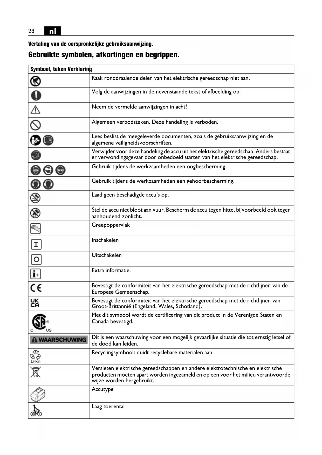Vertaling van de oorspronkelijke gebruiksaanwijzing. Gebruikte symbolen, afkortingen en begrippen. Symbool, teken Verklaring Raak ronddraaiende delen van het elektrische gereedschap niet aan. Volg de aanwijzingen in de nevenstaande tekst of afbeelding op. Neem de vermelde aanwijzingen in acht! Algemeen verbodsteken. Deze handeling is verboden. Lees beslist de meegeleverde documenten, zoals de gebruiksaanwijzing en de algemene veiligheidsvoorschriften. Verwijder voor deze handeling de accu uit het elektrische gereedschap. Anders bestaat er verwondingsgevaar door onbedoeld starten van het elektrische gereedschap. Gebruik tijdens de werkzaamheden een oogbescherming. Gebruik tijdens de werkzaamheden een gehoorbescherming. Laad geen beschadigde accu’s op. Stel de accu niet bloot aan vuur. Bescherm de accu tegen hitte, bijvoorbeeld ook tegen aanhoudend zonlicht. Greepoppervlak Inschakelen Uitschakelen Extra informatie. Bevestigt de conformiteit van het elektrische gereedschap met de richtlijnen van de Europese Gemeenschap. Bevestigt de conformiteit van het elektrische gereedschap met de richtlijnen van Groot-Brittannië (Engeland, Wales, Schotland). Met dit symbool wordt de certificering van dit product in de Verenigde Staten en Canada bevestigd. Dit is een waarschuwing voor een mogelijk gevaarlijke situatie die tot ernstig letsel of de dood kan leiden. Recyclingsymbool: duidt recyclebare materialen aan Versleten elektrische gereedschappen en andere elektrotechnische en elektrische producten moeten apart worden ingezameld en op een voor het milieu verantwoorde wijze worden hergebruikt. Accutype Laag toerental29