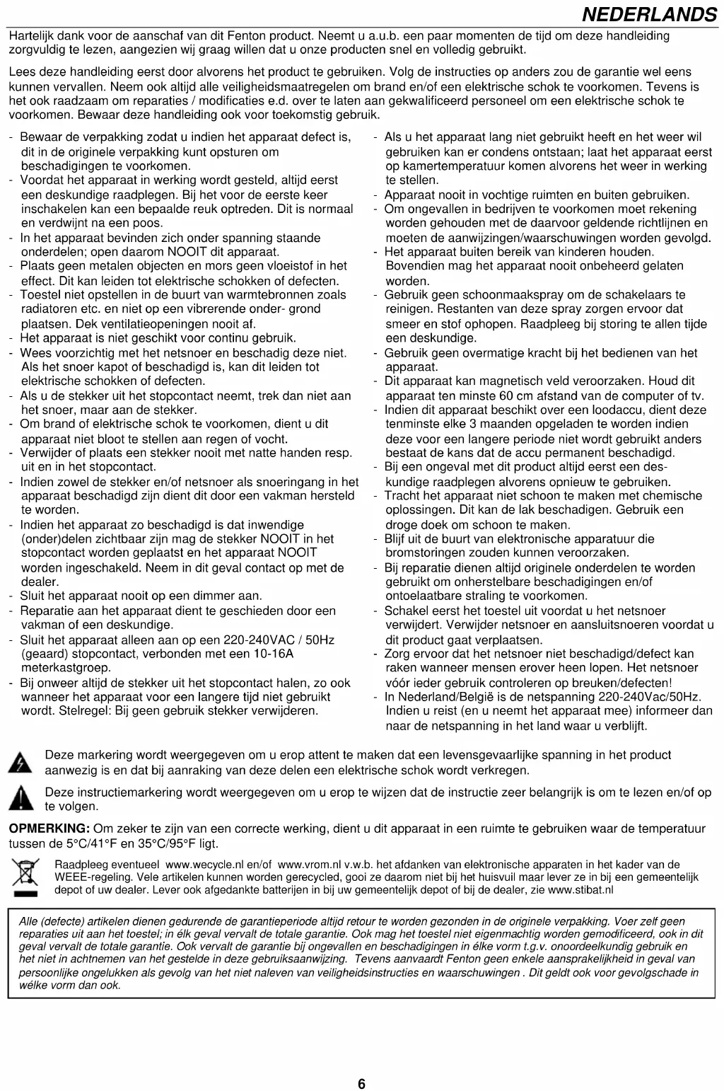 If password is required, you can enter "0000". Attention: The BT distance is approx. 10 meter without any barrier.6 NEDERLANDS Hartelijk dank voor de aanschaf van dit Fenton product. Neemt u a.u.b. een paar momenten de tijd om deze handleiding zorgvuldig te lezen, aangezien wij graag willen dat u onze producten snel en volledig gebruikt. Lees deze handleiding eerst door alvorens het product te gebruiken. Volg de instructies op anders zou de garantie wel eens kunnen vervallen. Neem ook altijd alle veiligheidsmaatregelen om brand en/of een elektrische schok te voorkomen. Tevens is het ook raadzaam om reparaties / modificaties e.d. over te laten aan gekwalificeerd personeel om een elektrische schok te voorkomen. Bewaar deze handleiding ook voor toekomstig gebruik. - Bewaar de verpakking zodat u indien het apparaat defect is, dit in de originele verpakking kunt opsturen om beschadigingen te voorkomen. - Voordat het apparaat in werking wordt gesteld, altijd eerst een deskundige raadplegen. Bij het voor de eerste keer inschakelen kan een bepaalde reuk optreden. Dit is normaal en verdwijnt na een poos. - In het apparaat bevinden zich onder spanning staande onderdelen; open daarom NOOIT dit apparaat. - Plaats geen metalen objecten en mors geen vloeistof in het effect. Dit kan leiden tot elektrische schokken of defecten. - Toestel niet opstellen in de buurt van warmtebronnen zoals radiatoren etc. en niet op een vibrerende onder- grond plaatsen. Dek ventilatieopeningen nooit af. - Het apparaat is niet geschikt voor continu gebruik. - Wees voorzichtig met het netsnoer en beschadig deze niet. Als het snoer kapot of beschadigd is, kan dit leiden tot elektrische schokken of defecten. - Als u de stekker uit het stopcontact neemt, trek dan niet aan het snoer, maar aan de stekker. - Om brand of elektrische schok te voorkomen, dient u dit apparaat niet bloot te stellen aan regen of vocht. - Verwijder of plaats een stekker nooit met natte handen resp. uit en in het stopcontact. - Indien zowel de stekker en/of netsnoer als snoeringang in het apparaat beschadigd zijn dient dit door een vakman hersteld te worden. - Indien het apparaat zo beschadigd is dat inwendige (onder)delen zichtbaar zijn mag de stekker NOOIT in het stopcontact worden geplaatst en het apparaat NOOIT worden ingeschakeld. Neem in dit geval contact op met de dealer. - Sluit het apparaat nooit op een dimmer aan. - Reparatie aan het apparaat dient te geschieden door een vakman of een deskundige. - Sluit het apparaat alleen aan op een 220-240VAC / 50Hz (geaard) stopcontact, verbonden met een 10-16A meterkastgroep. - Bij onweer altijd de stekker uit het stopcontact halen, zo ook wanneer het apparaat voor een langere tijd niet gebruikt wordt. Stelregel: Bij geen gebruik stekker verwijderen. - Als u het apparaat lang niet gebruikt heeft en het weer wil gebruiken kan er condens ontstaan; laat het apparaat eerst op kamertemperatuur komen alvorens het weer in werking te stellen. - Apparaat nooit in vochtige ruimten en buiten gebruiken. - Om ongevallen in bedrijven te voorkomen moet rekening worden gehouden met de daarvoor geldende richtlijnen en moeten de aanwijzingen/waarschuwingen worden gevolgd. - Het apparaat buiten bereik van kinderen houden. Bovendien mag het apparaat nooit onbeheerd gelaten worden. - Gebruik geen schoonmaakspray om de schakelaars te reinigen. Restanten van deze spray zorgen ervoor dat smeer en stof ophopen. Raadpleeg bij storing te allen tijde een deskundige. - Gebruik geen overmatige kracht bij het bedienen van het apparaat. - Dit apparaat kan magnetisch veld veroorzaken. Houd dit apparaat ten minste 60 cm afstand van de computer of tv. - Indien dit apparaat beschikt over een loodaccu, dient deze tenminste elke 3 maanden opgeladen te worden indien deze voor een langere periode niet wordt gebruikt anders bestaat de kans dat de accu permanent beschadigd. - Bij een ongeval met dit product altijd eerst een des- kundige raadplegen alvorens opnieuw te gebruiken. - Tracht het apparaat niet schoon te maken met chemische oplossingen. Dit kan de lak beschadigen. Gebruik een droge doek om schoon te maken. - Blijf uit de buurt van elektronische apparatuur die bromstoringen zouden kunnen veroorzaken. - Bij reparatie dienen altijd originele onderdelen te worden gebruikt om onherstelbare beschadigingen en/of ontoelaatbare straling te voorkomen. - Schakel eerst het toestel uit voordat u het netsnoer verwijdert. Verwijder netsnoer en aansluitsnoeren voordat u dit product gaat verplaatsen. - Zorg ervoor dat het netsnoer niet beschadigd/defect kan raken wanneer mensen erover heen lopen. Het netsnoer vóór ieder gebruik controleren op breuken/defecten! - In Nederland/België is de netspanning 220-240Vac/50Hz. Indien u reist (en u neemt het apparaat mee) informeer dan naar de netspanning in het land waar u verblijft.
