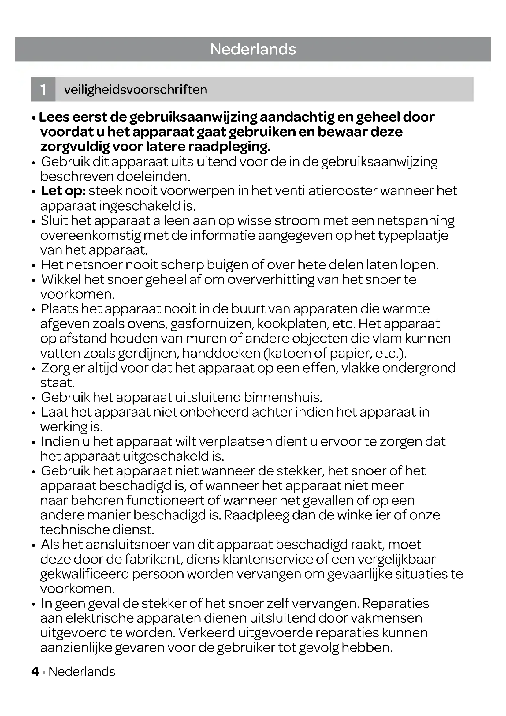 - In geen geval de stekker of het snoer zelf vervangen. Reparaties aan elektrische apparaten dienen uitsluitend door vakmensen uitgevoerd te worden. Verkeerd uitgevoerde reparaties kunnen aanzienlijke gevaren voor de gebruiker tot gevolg hebben.Nederlands • 5