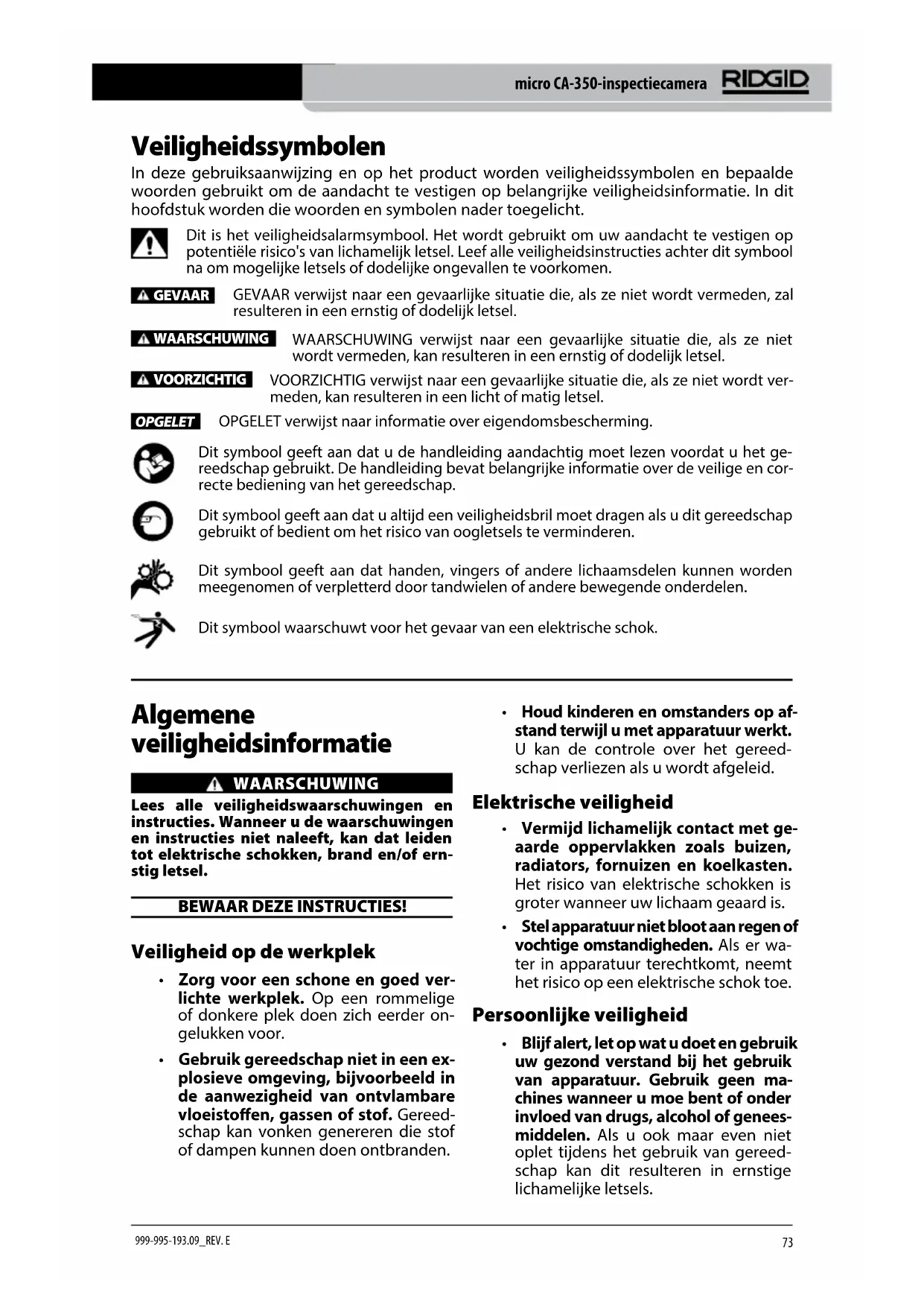 Specifieke veiligheidsinformatie WAARSCHUWING Dit hoofdstuk bevat belangrijke veilig‑ heidsinformatie die specifiek is voor de in‑ spectiecamera. Lees aandachtig de voorzorgsmaatregelen door voordat u de RIDGID® micro CA‑350 in‑ spectiecamera gebruikt, om het risico van elektrische schokken of andere ernstige letsels te verminderen. BEWAAR DEZE INSTRUCTIES! De draagtas van de micro CA‑350‑inspec‑ tiecamera bevat een houder voor de hand‑ leiding, zodat deze te allen tijde door de gebruiker van de camera kan worden ge‑ raadpleegd. micro CA‑350‑inspectiecamera veiligheid