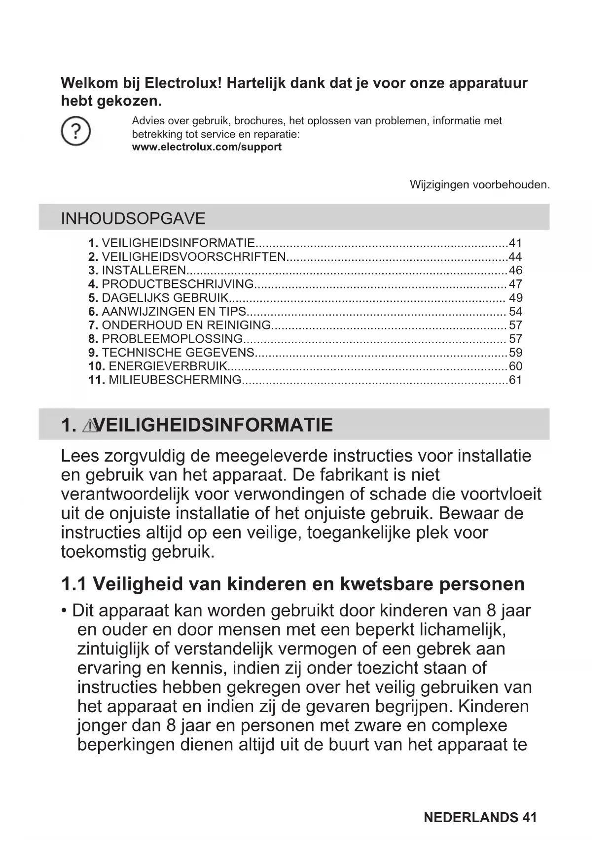 toepasselijke modus voor laag vermogen te bereiken Table title Stroomverbruik in uit-modus 0.3 W De maximale tijd die de apparatuur nodig heeft om automatisch de toepasselijke modus voor laag vermogen te bereiken 2 min 60 NEDERLANDS11. MILIEUBESCHERMING Recycleer de materialen met het symbool . Gooi de verpakking in een geschikte afvalcontainer om het te recycleren. Bescherm het milieu en de volksgezondheid en recycleer op een correcte manier het afval van elektrische en elektronische apparaten. Gooi apparaten gemarkeerd met het symbool niet weg met het huishoudelijk afval. Breng het product naar het milieustation bij u in de buurt of neem contact op met de gemeente. NEDERLANDS 61Welcome to Electrolux! Thank you for choosing our appliance. Table title.Get usage advice, brochures, troubleshooting, service and repair information:www.electrolux.com/supportSubject to change without notice. CONTENTS