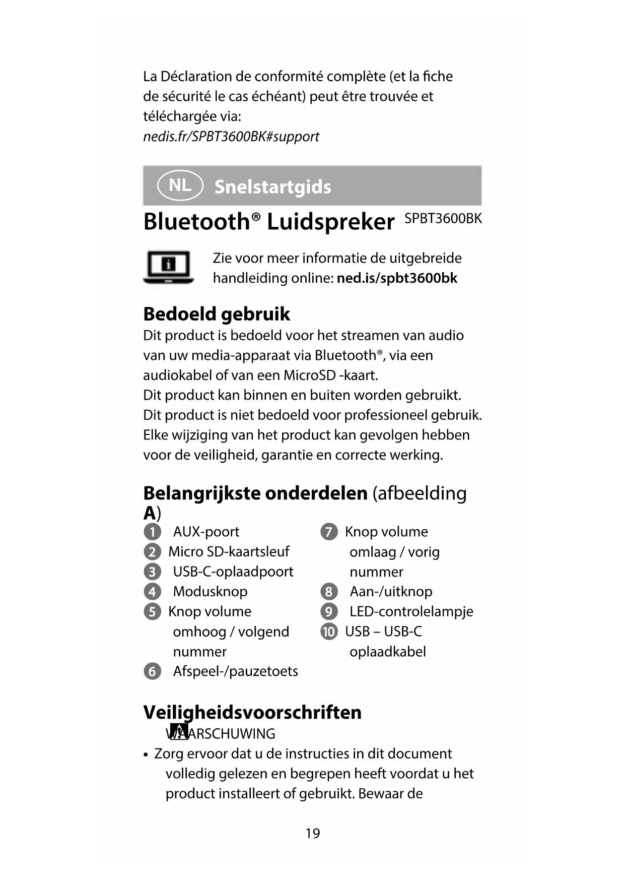 Snelstartgids Bluetooth® Luidspreker SPBT3600BKZie voor meer informatie de uitgebreide handleiding online: ned.is/spbt3600bk Bedoeld gebruik Dit product is bedoeld voor het streamen van audio van uw media-apparaat via Bluetooth®, via een audiokabel of van een MicroSD -kaart.Dit product kan binnen en buiten worden gebruikt.Dit product is niet bedoeld voor professioneel gebruik.Elke wijziging van het product kan gevolgen hebben voor de veiligheid, garantie en correcte werking. Belangrijkste onderdelen (afbeelding