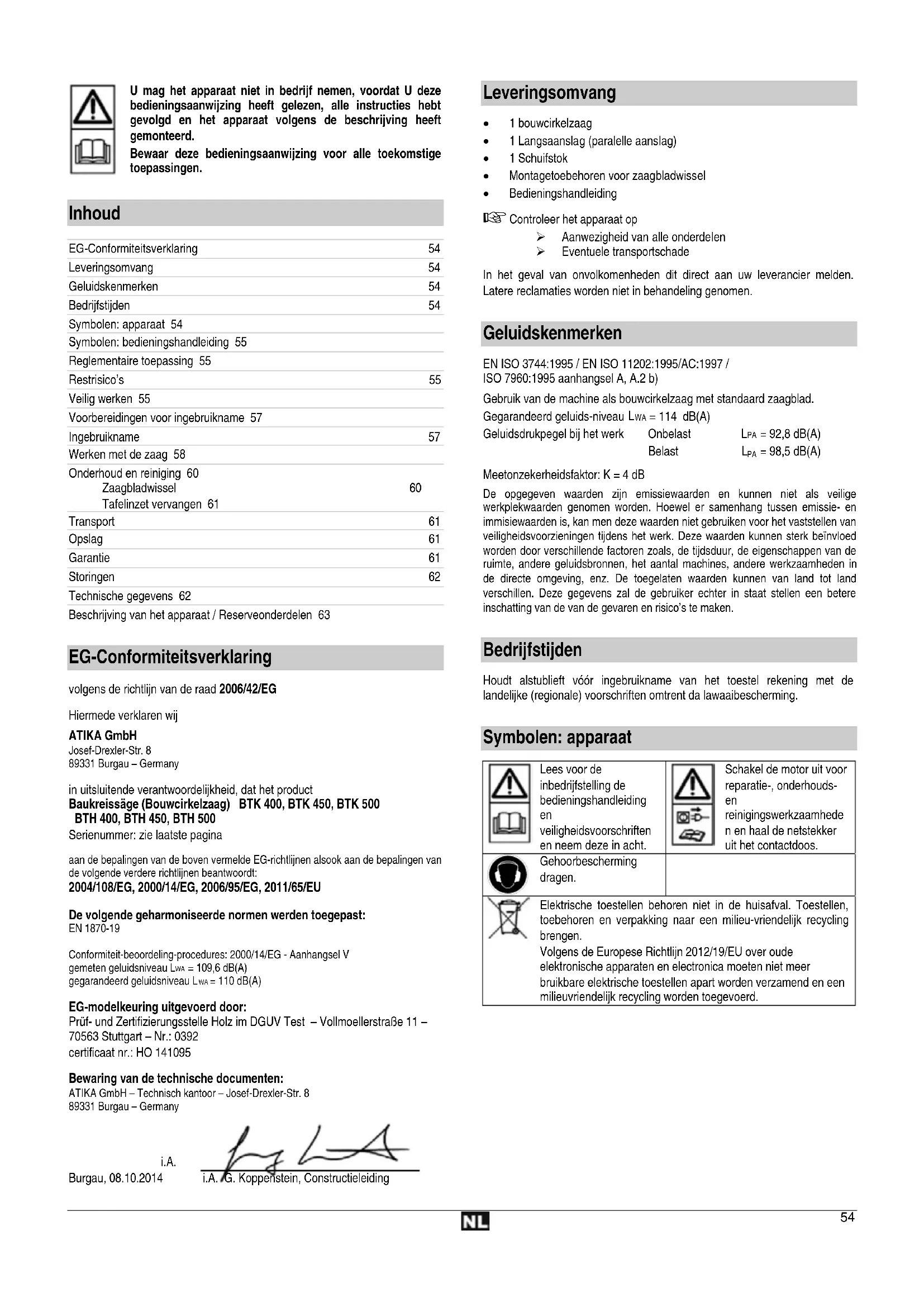 EG-Conformiteitsverklaring volgens de richtlijn van de raad 2006/42/EG Hiermede verklaren wij ATIKA GmbH Josef-Drexler-Str. 8 89331 Burgau – Germany in uitsluitende verantwoordelijkheid, dat het product Baukreissäge (Bouwcirkelzaag) BTK 400, BTK 450, BTK 500