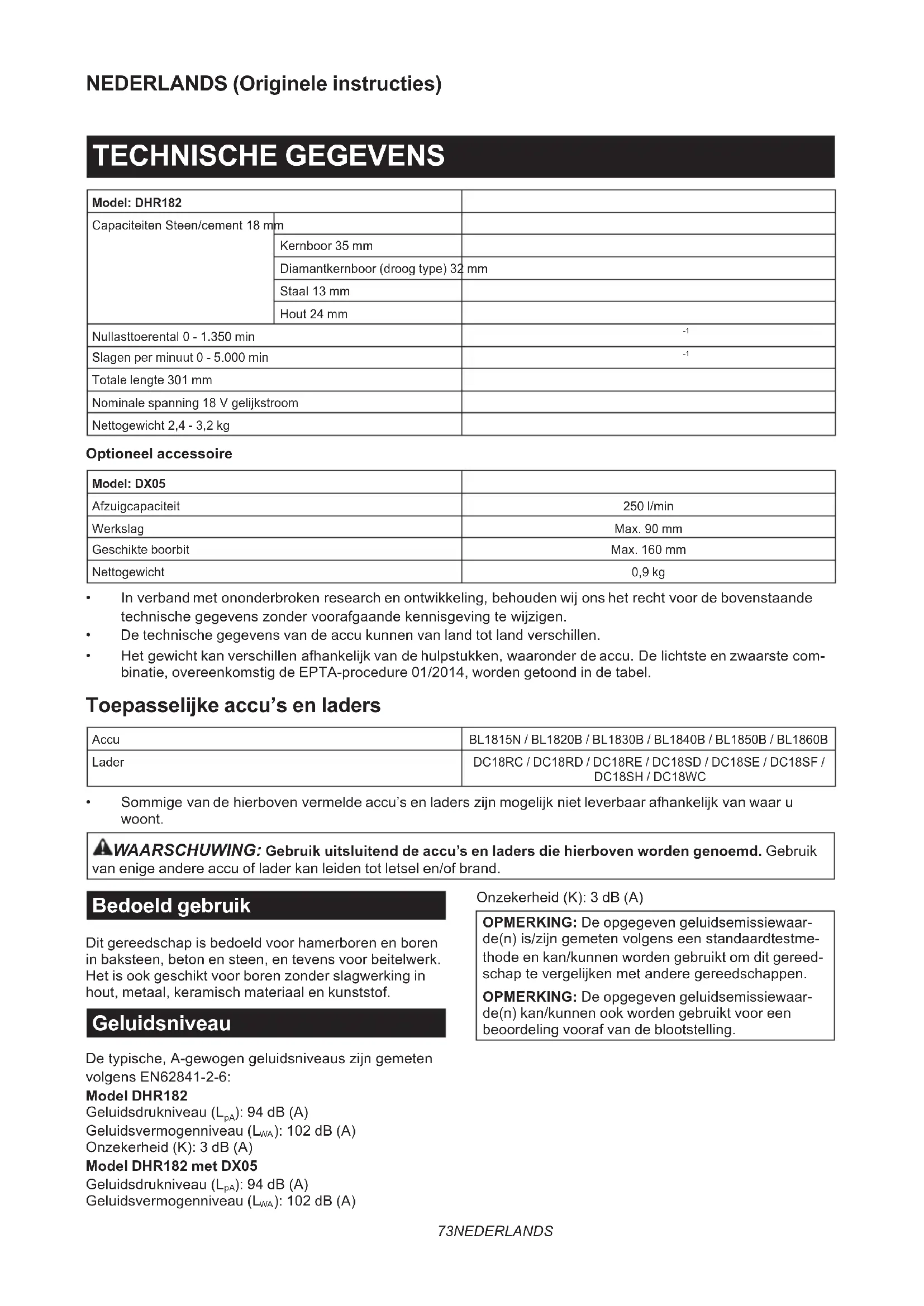 - Sommigevandehierbovenvermeldeaccu’senladerszijnmogelijknietleverbaarafhankelijkvanwaaru woont. WAARSCHUWING: Gebruik uitsluitend de accu’s en laders die hierboven worden genoemd. Gebruik van enige andere accu of lader kan leiden tot letsel en/of brand. Bedoeld gebruik Dit gereedschap is bedoeld voor hamerboren en boren in baksteen, beton en steen, en tevens voor beitelwerk. Het is ook geschikt voor boren zonder slagwerking in hout, metaal, keramisch materiaal en kunststof. Geluidsniveau Detypische,A-gewogengeluidsniveauszijngemeten volgens EN62841-2-6: Model DHR182 Geluidsdrukniveau (L