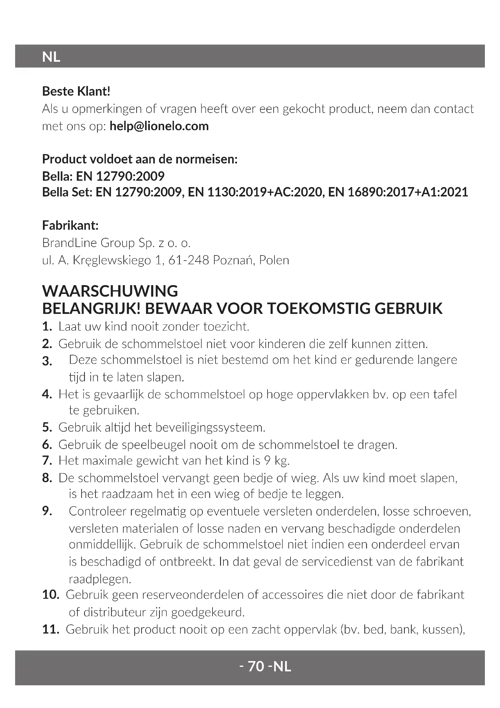 Beste Klant! Als u opmerkingen of vragen hee over een gekocht product, neem dan contact met ons op: help@lionelo.com Product voldoet aan de normeisen: Bella: EN 12790:2009 Bella Set: EN 12790:2009, EN 1130:2019+AC:2020, EN 16890:2017+A1:2021 Fabrikant: BrandLine Group Sp. z o. o. ul. A. Kręglewskiego 1, 61-248 Poznań, Polen WAARSCHUWING