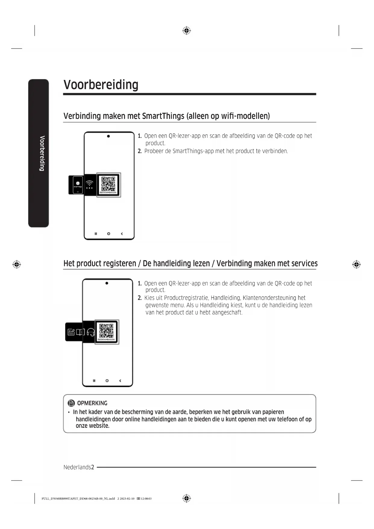 - In het kader van de bescherming van de aarde, beperken we het gebruik van papieren handleidingen door online handleidingen aan te bieden die u kunt openen met uw telefoon of op onze website. FULL_DW60BB890UAPET_DD68-00254B-00_NL.indd 2 2023-02-10 12:08:03Nederlands 3 Inhoud Inhoud Veiligheidsinformatie 5 Wat u moet weten over de veiligheidsvoorschriften 5 Belangrijke veiligheidssymbolen 5 WEEE-gerelateerde instructies 6 Belangrijke veiligheidsvoorschriften 7 Instructies voor het gebruik van de vaatwasser 9 Instructies voor het beschermen van uw kinderen 10 Instructies voor het installeren van de vaatwasser 10 Installatie 13 Wat is inbegrepen 13 Montagevereisten 17 Inbouwinstallatie onder de gootsteen (voor vrijstaand model) 19 Stappenplan installatie 20 Afmetingen gat 21 Plint 30 SmartThings (alleen bepaalde modellen) 32 Mededeling open source 35 Voor u begint 36 De vaatwasser in een oogopslag 36 Voorwerpen die ongeschikt zijn voor de vaatwasser 37 Standaard gebruik van de rekken 38 Vaatwasmiddeldispenser 42 Spoelmiddelreservoir 44 Zoutreservoir 45 Instellingen 46 Instellingen (met uitzondering van DW60BB89*-modellen) 49 Functies 52 Bedieningspaneel (voor DW60BB89*-modellen) 52 Bedieningspaneel (met uitzondering van DW60BB89*-modellen) 53 Programma-overzicht 54 Eenvoudig starten 56 Onderhoud 57 Schoonmaken 57 De afvoerpomp reinigen 61 Langdurig onderhoud 61 FULL_DW60BB890UAPET_DD68-00254B-00_NL.indd 3 2023-02-10 12:08:03Nederlands4 InhoudInhoud Problemen oplossen 62 Controlepunten 62 Informatiecodes 65 Vaatwasprogramma's 66 Bijlage 70 Transport/verplaatsen 70 Vorstbeveiliging 70 De vaatwasser op een milieuvriendelijke wijze afdanken 70 Tip voor water- en energiebesparing 71 EPREL-gegevens 71 Specicaties 72 Voor standaardtest 73 FULL_DW60BB890UAPET_DD68-00254B-00_NL.indd 4 2023-02-10 12:08:03Nederlands 5 Veiligheidsinformatie Veiligheidsinformatie Gefeliciteerd met uw nieuwe Samsung-vaatwasser. Deze handleiding bevat belangrijke informatie over de installatie, het gebruik en het onderhoud van uw vaatwasmachine. Lees deze gebruikershandleiding aandachtig door om optimaal gebruik te maken van de vele voordelen en functies die deze vaatwasser u biedt. Wat u moet weten over de veiligheidsvoorschriften Lees deze handleiding aandachtig door, zodat u weet hoe u dit nieuwe apparaat met zijn uitgebreide mogelijkheden en functies op veilige en efciënte wijze gebruikt en bewaar de handleiding ter referentie op een veilige plaats nabij het apparaat. Gebruik dit apparaat alleen voor de doeleinden waarvoor het is ontworpen, zoals beschreven in deze gebruikershandleiding. In de waarschuwingen en veiligheidsvoorschriften in deze handleiding worden niet alle mogelijke omstandigheden en situaties besproken. Het is uw eigen verantwoordelijkheid om uw gezond verstand te gebruiken en voorzichtig te zijn bij de installatie, de bediening en het onderhoud van uw vaatwasser. Omdat de volgende gebruiksaanwijzingen van toepassing zijn op meerdere modellen, kunnen de specicaties van uw vaatwasser enigszins afwijken van de specicaties die in deze handleiding worden omschreven en zijn mogelijk niet alle waarschuwingen van toepassing. Neem contact op met het dichtstbijzijnde servicecentrum als u vragen of opmerkingen hebt of ga naar www.samsung.com voor online ondersteuning en informatie. Belangrijke veiligheidssymbolen Waar staan de pictogrammen en tekens in deze gebruikershandleiding voor: WAARSCHUWING Gevaar of onveilige handelingen die kunnen leiden tot ernstig persoonlijk letsel, een dodelijke aoop of materiële schade. LET OP Gevaar of onveilige handelingen die kunnen leiden tot persoonlijk letsel of materiële schade. OPMERKING Geeft aan dat er risico bestaat op persoonlijk letsel of materiële schade. Deze waarschuwingssymbolen dienen om persoonlijk letsel van uzelf en van anderen te voorkomen. Volg ze nauwgezet op. Bewaar deze instructies op een veilige plek en zorg ervoor dat nieuwe gebruikers vertrouwd zijn met de inhoud. Geef de instructies door aan een eventuele toekomstige eigenaar. FULL_DW60BB890UAPET_DD68-00254B-00_NL.indd 5 2023-02-10 12:08:03Nederlands6 Veiligheidsinformatie Veiligheidsinformatie WEEE-gerelateerde instructies Correcte verwijdering van dit product (elektrische & elektronische afvalapparatuur) (Van toepassing in landen waar afval gescheiden wordt ingezameld) Dit merkteken op het product, de accessoires of het informatiemateriaal duidt erop dat het product en zijn elektronische accessoires (bv. lader, headset, USB-kabel) niet met ander huishoudelijk afval verwijderd mogen worden aan het einde van hun gebruiksduur. Om mogelijke schade aan het milieu of de menselijke gezondheid door ongecontroleerde afvalverwijdering te voorkomen, moet u deze artikelen van andere soorten afval scheiden en op een verantwoorde manier recyclen, zodat het duurzame hergebruik van materiaalbronnen wordt bevorderd. Huishoudelijke gebruikers moeten contact opnemen met de winkel waar ze dit product hebben gekocht of met de gemeente waar ze wonen om te vernemen waar en hoe ze deze artikelen milieuvriendelijk kunnen laten recyclen. Zakelijke gebruikers moeten contact opnemen met hun leverancier en de algemene voorwaarden van de koopovereenkomst nalezen. Dit product en zijn elektronische accessoires mogen niet met ander bedrijfsafval voor verwijdering worden gemengd. Ga voor meer informatie over de milieuverbintenissen en productspecieke wettelijke verplichtingen van Samsung (bijvoorbeeld REACH, WEEE, batterijen) naar onze duurzaamheidspagina op Samsung.com FULL_DW60BB890UAPET_DD68-00254B-00_NL.indd 6 2023-02-10 12:08:03Nederlands 7 Veiligheidsinformatie Belangrijke veiligheidsvoorschriften Om de kans op brand, elektrische schokken of persoonlijk letsel bij het gebruik van uw apparaat te verminderen, dient u de veiligheidsvoorschriften te volgen, waaronder de volgende: