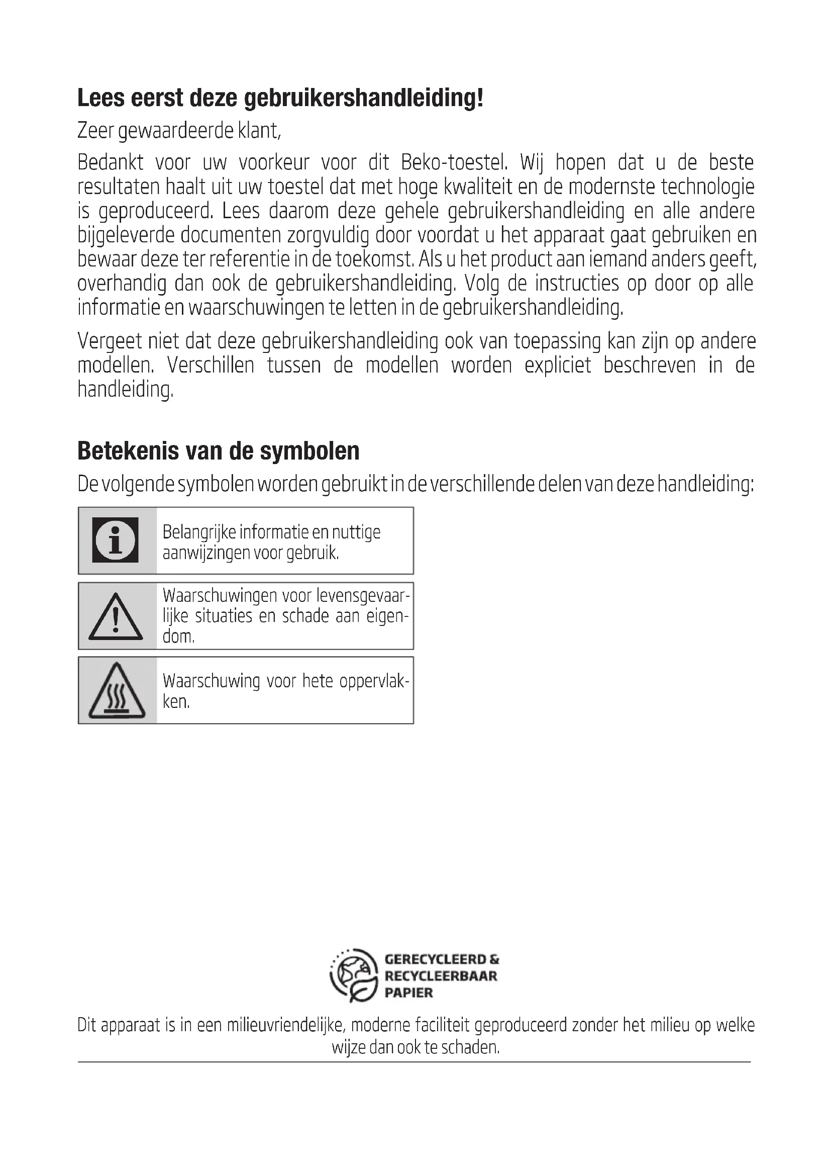 Waarschuwingen voor levensgevaar- lijke situaties en schade aan eigen- dom. Waarschuwing voor hete oppervlak- ken. Dit apparaat is in een milieuvriendelijke, moderne faciliteit geproduceerd zonder het milieu op welke wijze dan ook te schaden.Magnetronoven / Gebruikershandleiding 118 / NL Belangrijke veiligheids- instructies Lees aan- dachtig en bewaar ze voor een eventuele toe- komstige raadpleging