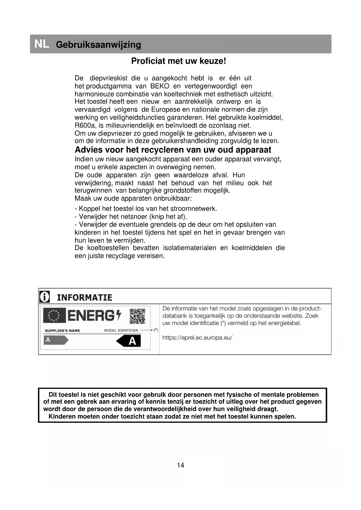 Bedeutung des Symbols „Mülltonne“ Schonen Sie unsere Umwelt, Elektrogeräte gehören nicht in den Hausmüll. Nutzen Sie die für die Entsorgung von Elektrogeräten vorgesehenen Sammelstellen und geben dort Ihre Elektrogeräte ab die Sie nicht mehr benutzen werden. Sie helfen damit die potenziellen Auswirkungen, durch falsche Entsorgung, auf die Umwelt und die menschliche Gesundheit zu vermeiden. Sie leisten damit Ihren Beitrag zur Wiederverwertung, zum Recycling und zu anderen Formen der Verwertung von Elektro- und Elektronik-Altgeräten. Informationen, wo die Geräte zu entsorgen sind, erhalten Sie über Ihre Kommunen oder die Gemeindeverwaltungen. In vielen Ländern der EU ist die Entsorgung von Elektro- und Elektronik-Altgeräten über den Haus- und/oder Restmüll ab 13.8.2005 verboten. In Deutschland ab 23.3.2006.Proficiat met uw keuze! De diepvrieskist die u aangekocht hebt is er één uit het productgamma van BEKO en vertegenwoordigt een harmonieuze combinatie van koeltechniek met esthetisch uitzicht. Het toestel heeft een nieuw en aantrekkelijk ontwerp en is vervaardigd volgens de Europese en nationale normen die zijn werking en veiligheidsfuncties garanderen. Het gebruikte koelmiddel, R600a, is milieuvriendelijk en beïnvloedt de ozonlaag niet. Om uw diepvriezer zo goed mogelijk te gebruiken, afviseren we u om de informatie in deze gebruikershandleiding zorgvuldig te lezen. Advies voor het recycleren van uw oud apparaat Indien uw nieuw aangekocht apparaat een ouder apparaat vervangt, moet u enkele aspecten in overweging nemen. De oude apparaten zijn geen waardeloze afval. Hun verwijdering, maakt naast het behoud van het milieu ook het terugwinnen van belangrijke grondstoffen mogelijk. Maak uw oude apparaten onbruikbaar: - Koppel het toestel los van het stroomnetwerk. - Verwijder het netsnoer (knip het af). - Verwijder de eventuele grendels op de deur om het opsluiten van kinderen in het toestel tijdens het spel en het in gevaar brengen van hun leven te vermijden. De koeltoestellen bevatten isolatiematerialen en koelmiddelen die een juiste recyclage vereisen.