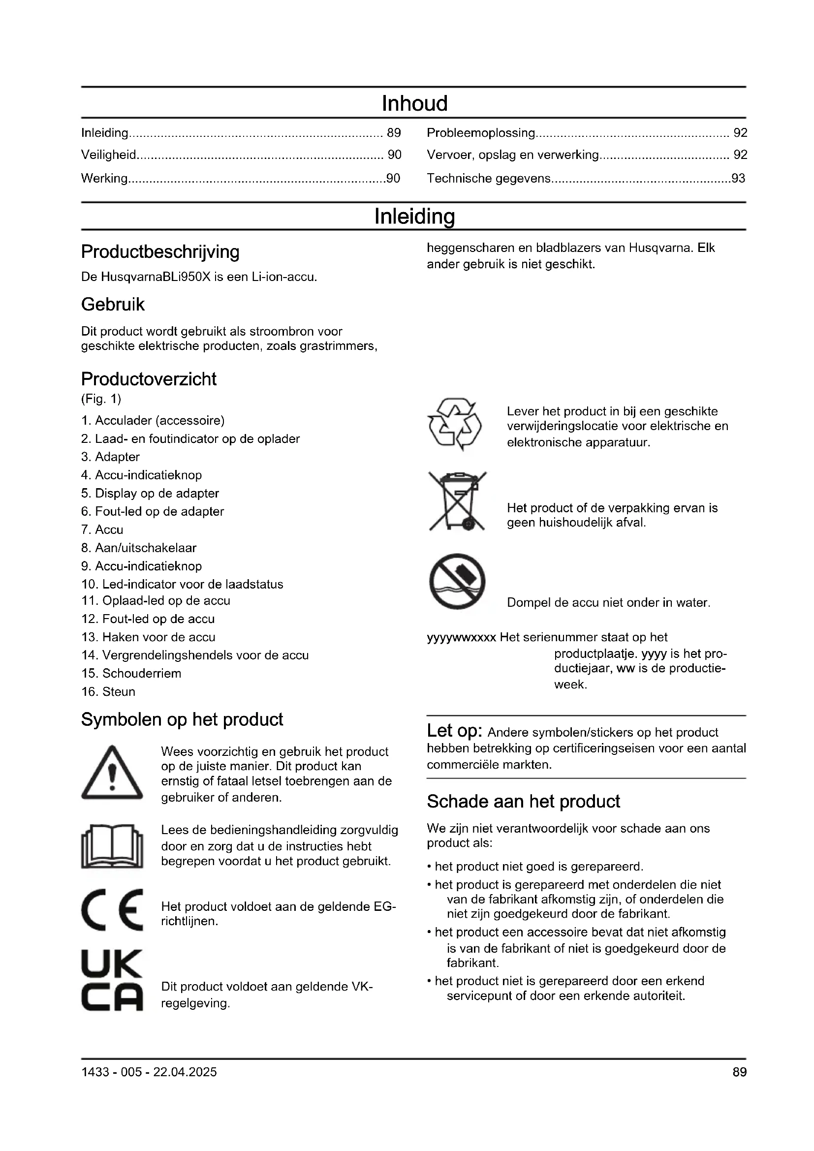 Symbolen op het product Wees voorzichtig en gebruik het product op de juiste manier. Dit product kan ernstig of fataal letsel toebrengen aan de gebruiker of anderen. Lees de bedieningshandleiding zorgvuldig door en zorg dat u de instructies hebt begrepen voordat u het product gebruikt. Het product voldoet aan de geldende EG- richtlijnen. Dit product voldoet aan geldende VK- regelgeving. Lever het product in bij een geschikte verwijderingslocatie voor elektrische en elektronische apparatuur. Het product of de verpakking ervan is geen huishoudelijk afval. Dompel de accu niet onder in water. yyyywwxxxx Het serienummer staat op het productplaatje. yyyy is het pro- ductiejaar, ww is de productie- week. Let op: Andere symbolen/stickers op het product hebben betrekking op certificeringseisen voor een aantal commerciële markten. Schade aan het product We zijn niet verantwoordelijk voor schade aan ons product als: