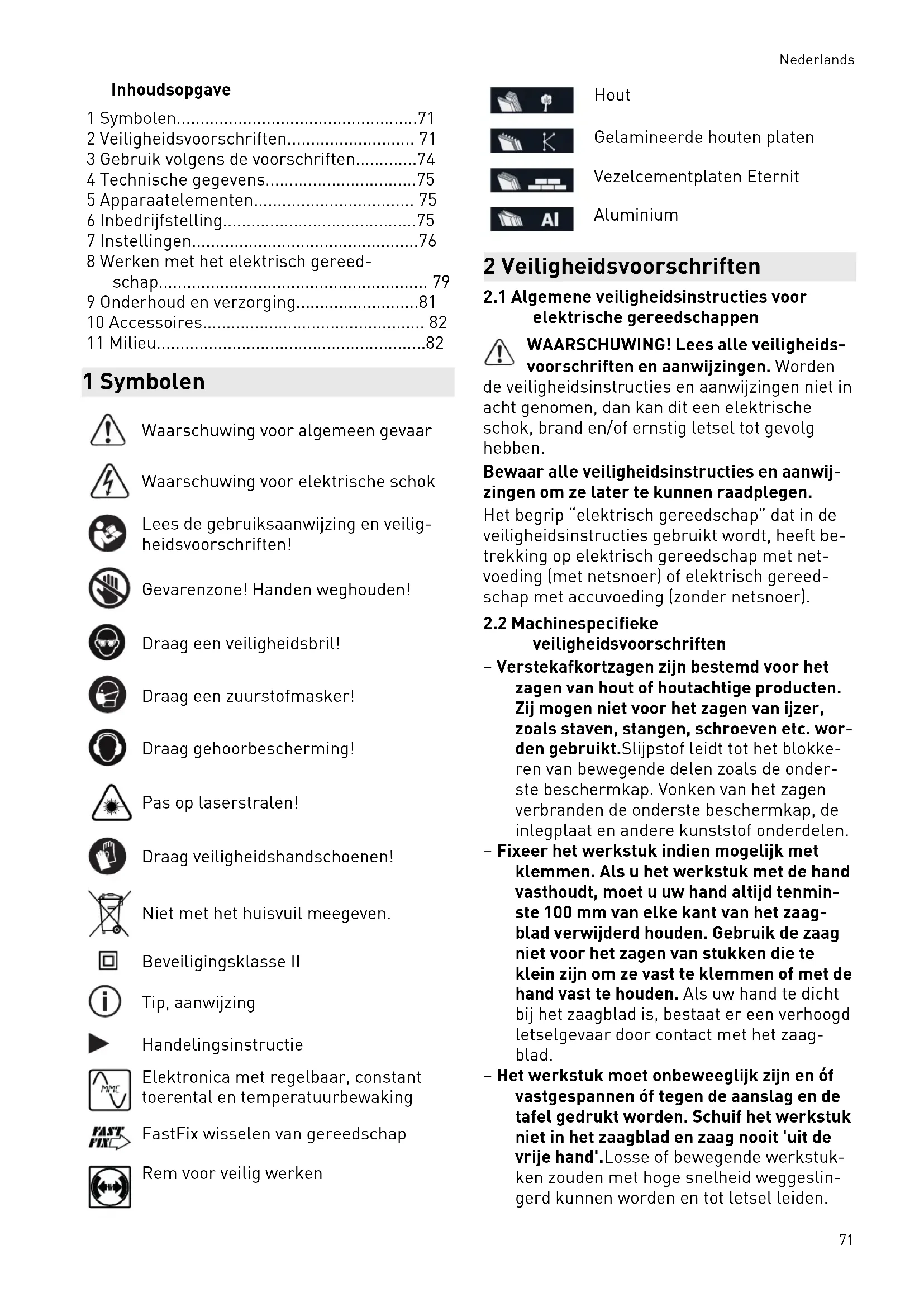 Draag ter bescherming van uw ge zondheid een P2-stofmasker. Zorg in ge sloten ruimtes voor voldoende ventilatie en sluit een mobiele stofzuiger aan. – Vervang aangezaagde of beschadigde aan slagen. Beschadigde aanslagen kunnen bij het werken met de zaag worden weggeslin gerd. Omstanders kunnen letsel oplopen. – Alleen originele Festool accessoires en verbruiksmaterialen gebruiken. Alleen door Festool geteste en goedgekeurde ac cessoires zijn veilig en perfect op de ma chine en het gebruik afgestemd. – Het elektrische gereedschap alleen in bin nenruimtes en droge omgeving gebruiken.