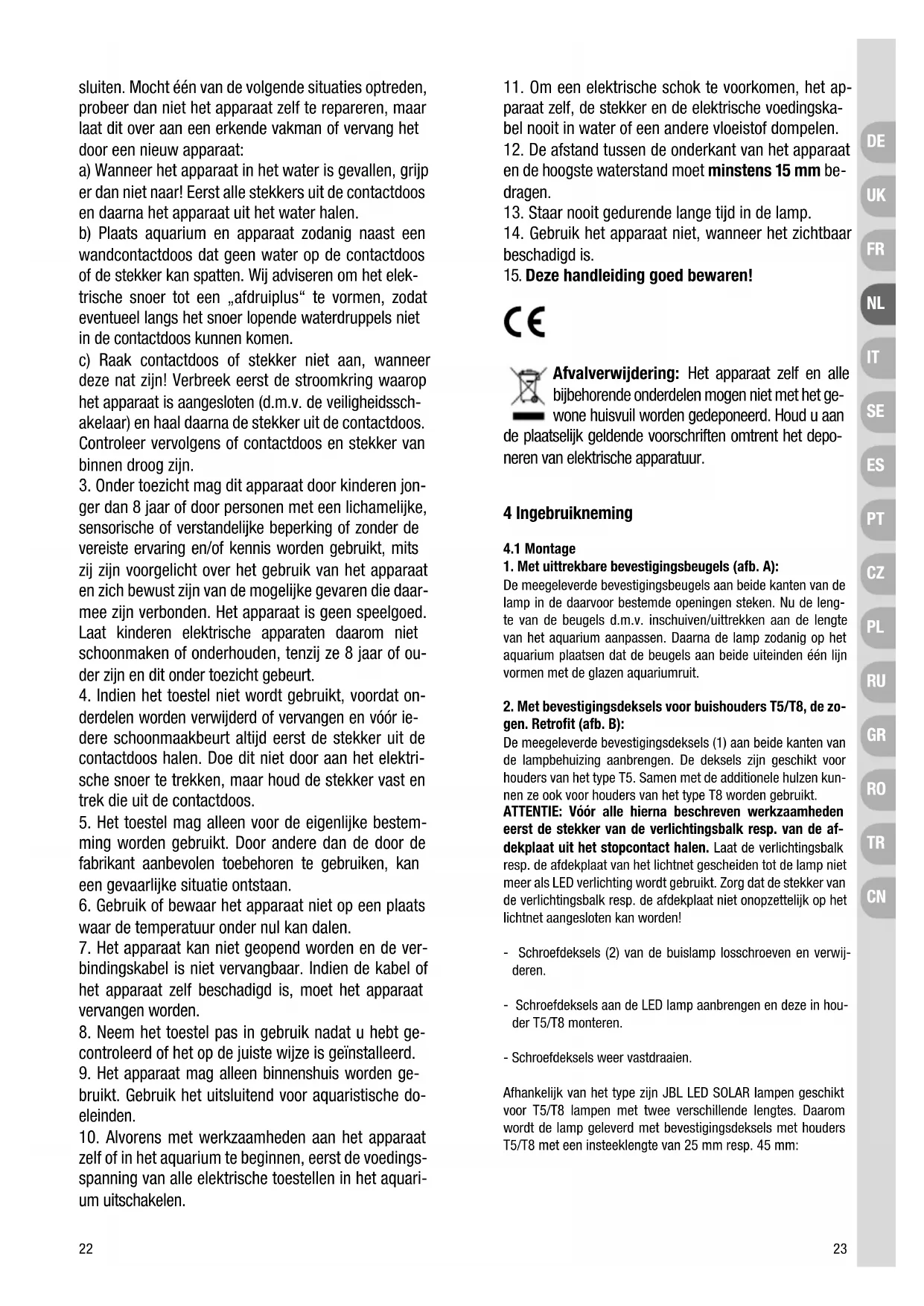 gen. Retrofit (afb. B): De meegeleverde bevestigingsdeksels (1) aan beide kanten van de lampbehuizing aanbrengen. De deksels zijn geschikt voor houders van het type T5. Samen met de additionele hulzen kun- nen ze ook voor houders van het type T8 worden gebruikt. ATTENTIE: Vóór alle hierna beschreven werkzaamheden eerst de stekker van de verlichtingsbalk resp. van de af- dekplaat uit het stopcontact halen. Laat de verlichtingsbalk resp. de afdekplaat van het lichtnet gescheiden tot de lamp niet meer als LED verlichting wordt gebruikt. Zorg dat de stekker van de verlichtingsbalk resp. de afdekplaat niet onopzettelijk op het lichtnet aangesloten kan worden! - Schroefdeksels (2) van de buislamp losschroeven en verwij- deren. - Schroefdeksels aan de LED lamp aanbrengen en deze in hou- der T5/T8 monteren. - Schroefdeksels weer vastdraaien. Afhankelijk van het type zijn JBL LED SOLAR lampen geschikt voor T5/T8 lampen met twee verschillende lengtes. Daarom wordt de lamp geleverd met bevestigingsdeksels met houders T5/T8 met een insteeklengte van 25 mm resp. 45 mm: sluiten. Mocht één van de volgende situaties optreden, probeer dan niet het apparaat zelf te repareren, maar laat dit over aan een erkende vakman of vervang het door een nieuw apparaat: a) Wanneer het apparaat in het water is gevallen, grijp er dan niet naar! Eerst alle stekkers uit de contactdoos en daarna het apparaat uit het water halen. b) Plaats aquarium en apparaat zodanig naast een wandcontactdoos dat geen water op de contactdoos of de stekker kan spatten. Wij adviseren om het elek- trische snoer tot een „afdruiplus“ te vormen, zodat eventueel langs het snoer lopende waterdruppels niet in de contactdoos kunnen komen. c) Raak contactdoos of stekker niet aan, wanneer deze nat zijn! Verbreek eerst de stroomkring waarop het apparaat is aangesloten (d.m.v. de veiligheidssch- akelaar) en haal daarna de stekker uit de contactdoos. Controleer vervolgens of contactdoos en stekker van binnen droog zijn.
