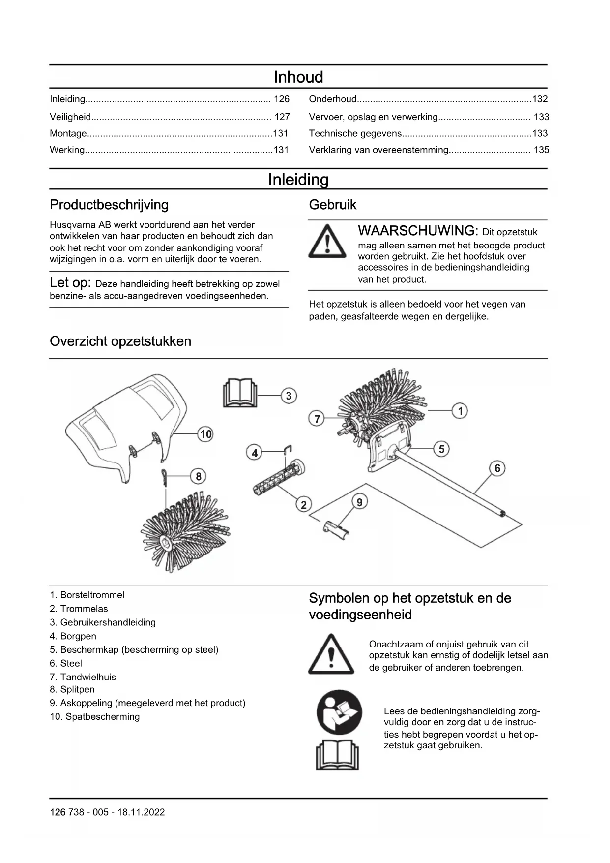 - Verklaring van overeenstemming Inleiding Productbeschrijving Husqvarna AB werkt voortdurend aan het verder ontwikkelen van haar producten en behoudt zich dan ook het recht voor om zonder aankondiging vooraf wijzigingen in o.a. vorm en uiterlijk door te voeren. Let op: Deze handleiding heeft betrekking op zowel benzine- als accu-aangedreven voedingseenheden. Gebruik WAARSCHUWING: Dit opzetstuk mag alleen samen met het beoogde product worden gebruikt. Zie het hoofdstuk over accessoires in de bedieningshandleiding van het product. Het opzetstuk is alleen bedoeld voor het vegen van paden, geasfalteerde wegen en dergelijke. Overzicht opzetstukken p. 135