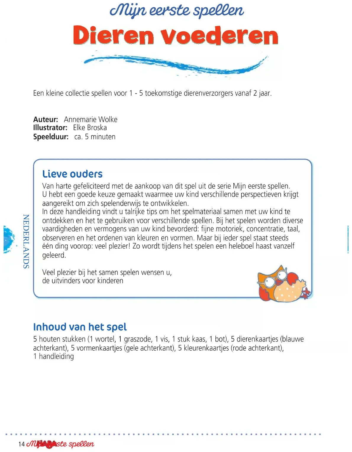 - Non ? Dommage ! Tous les joueurs observent ce que représente la plaquette, elle est retournée face cachée. Ensuite c’est au tour de l’enfant suivant de retourner une plaquette de son choix. Fin de la partie La partie se termine dès qu’un joueur a complété son ensemble avec les plaquettes-animaux et couleurs. Cet animal se réjouit d’avoir été bien nourri. Les autres joueurs peuvent continuer à jouer jusqu’à ce que tous les joueurs aient collecté toutes leurs plaquettes.14 Mijn eerste spellen NEDERLANDS Mijn eerste spellen Dieren voederen Een kleine collectie spellen voor 1 - 5 toekomstige dierenverzorgers vanaf 2 jaar. Auteur: Annemarie Wolke Illustrator: Elke Broska Speelduur: ca. 5 minuten Lieve ouders Van harte gefeliciteerd met de aankoop van dit spel uit de serie Mijn eerste spellen. U hebt een goede keuze gemaakt waarmee uw kind verschillende perspectieven krijgt aangereikt om zich spelenderwijs te ontwikkelen. In deze handleiding vindt u talrijke tips om het spelmateriaal samen met uw kind te ontdekken en het te gebruiken voor verschillende spellen. Bij het spelen worden diverse vaardigheden en vermogens van uw kind bevorderd: fijne motoriek, concentratie, taal, observeren en het ordenen van kleuren en vormen. Maar bij ieder spel staat steeds één ding voorop: veel plezier! Zo wordt tijdens het spelen een heleboel haast vanzelf geleerd. Veel plezier bij het samen spelen wensen u, de uitvinders voor kinderen Inhoud van het spel 5 houten stukken (1 wortel, 1 graszode, 1 vis, 1 stuk kaas, 1 bot), 5 dierenkaartjes (blauwe achterkant), 5 vormenkaartjes (gele achterkant), 5 kleurenkaartjes (rode achterkant), 1 handleiding15Mijn eerste spellen NEDERLANDS