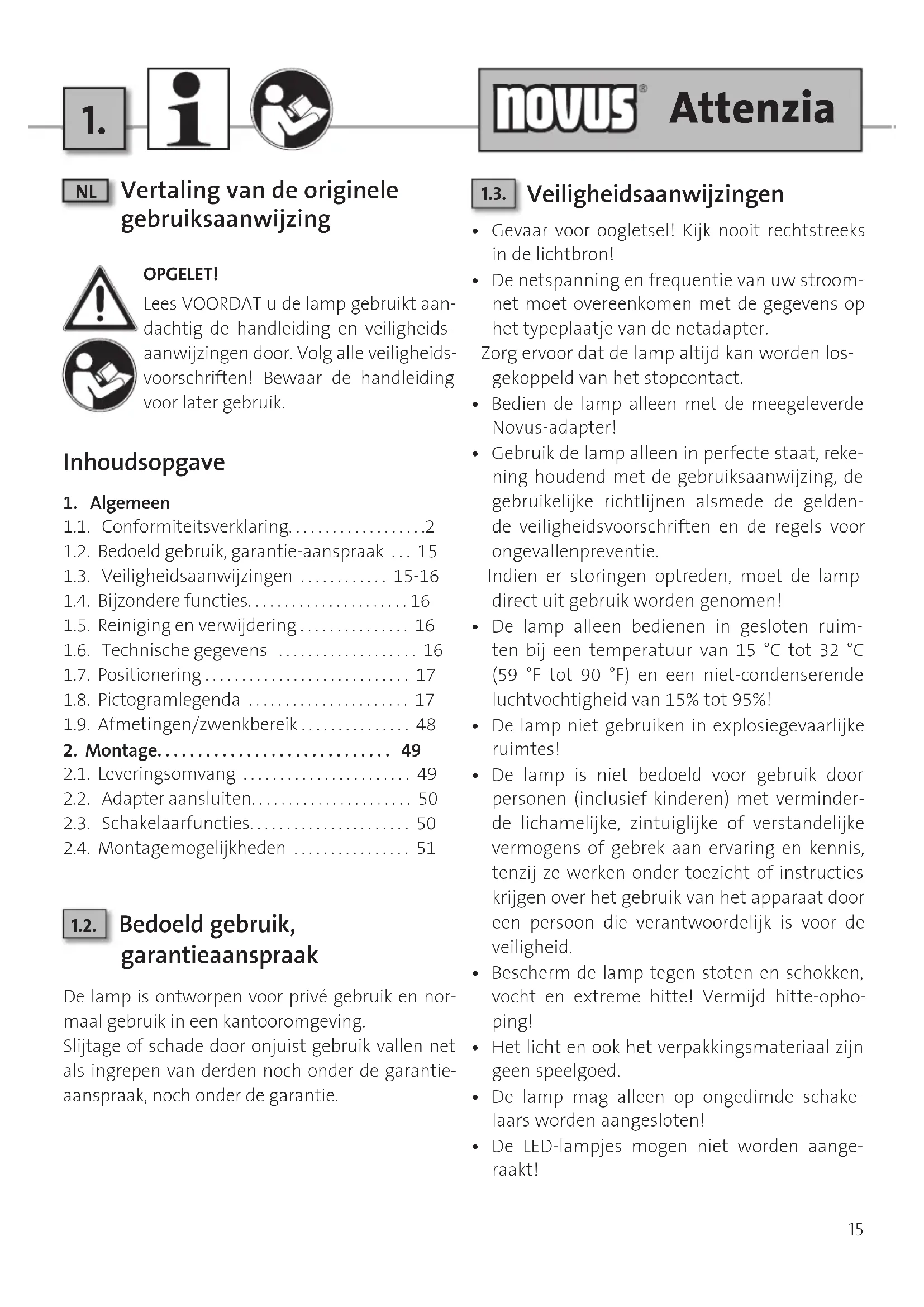 Conformiteitsverklaring: Wij verklaren in onze hoedanigheid als alleen verant- woordelijke dat deze bureaulamp van NOVUS aan de betreffende veiligheids- en gezondheidseisen van de EG-productveiligheidsrichtlijn * voldoet. Het appa- raat komt overeen met de volgende normen: ** volgens de bepalingen van de richtlijnen ***. Uitgave ****.
