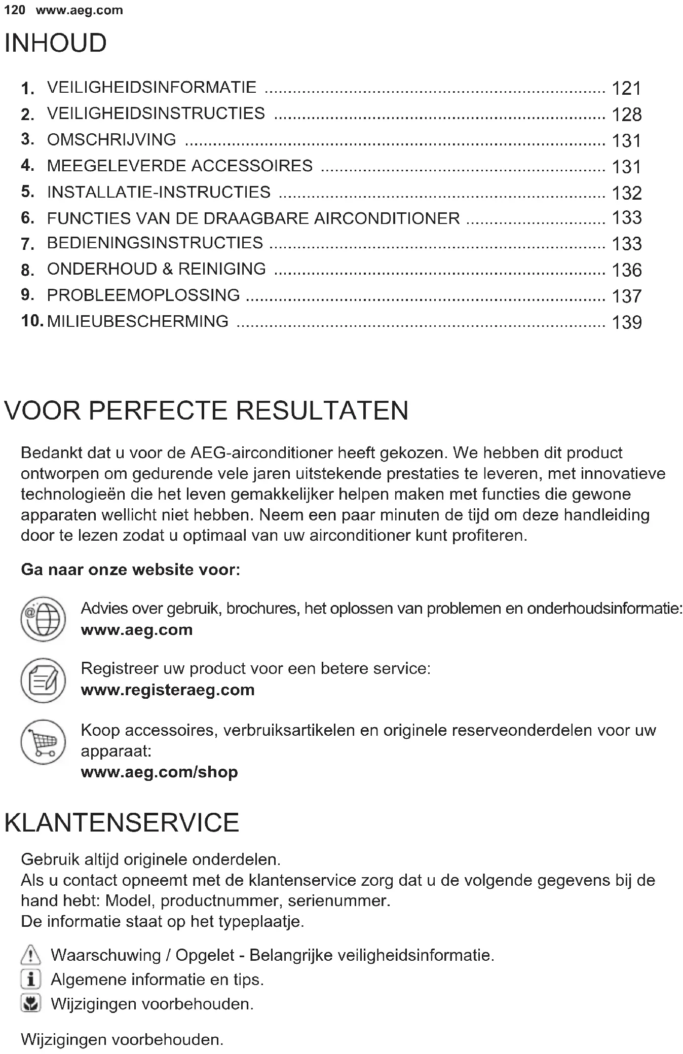 KLANTENSERVICE Bedankt dat u voor de AEG-airconditioner heeft gekozen. We hebben dit product ontworpen om gedurende vele jaren uitstekende prestaties te leveren, met innovatieve technologieën die het leven gemakkelijker helpen maken met functies die gewone apparaten wellicht niet hebben. Neem een paar minuten de tijd om deze handleiding door te lezen zodat u optimaal van uw airconditioner kunt profiteren. Gebruik altijd originele onderdelen. Als u contact opneemt met de klantenservice zorg dat u de volgende gegevens bij de hand hebt: Model, productnummer, serienummer. De informatie staat op het typeplaatje. Ga naar onze website voor: Advies over gebruik, brochures, het oplossen van problemen en onderhoudsinformatie: www.aeg.com Registreer uw product voor een betere service: www.registeraeg.com Koop accessoires, verbruiksartikelen en originele reserveonderdelen voor uw apparaat: www.aeg.com/shop