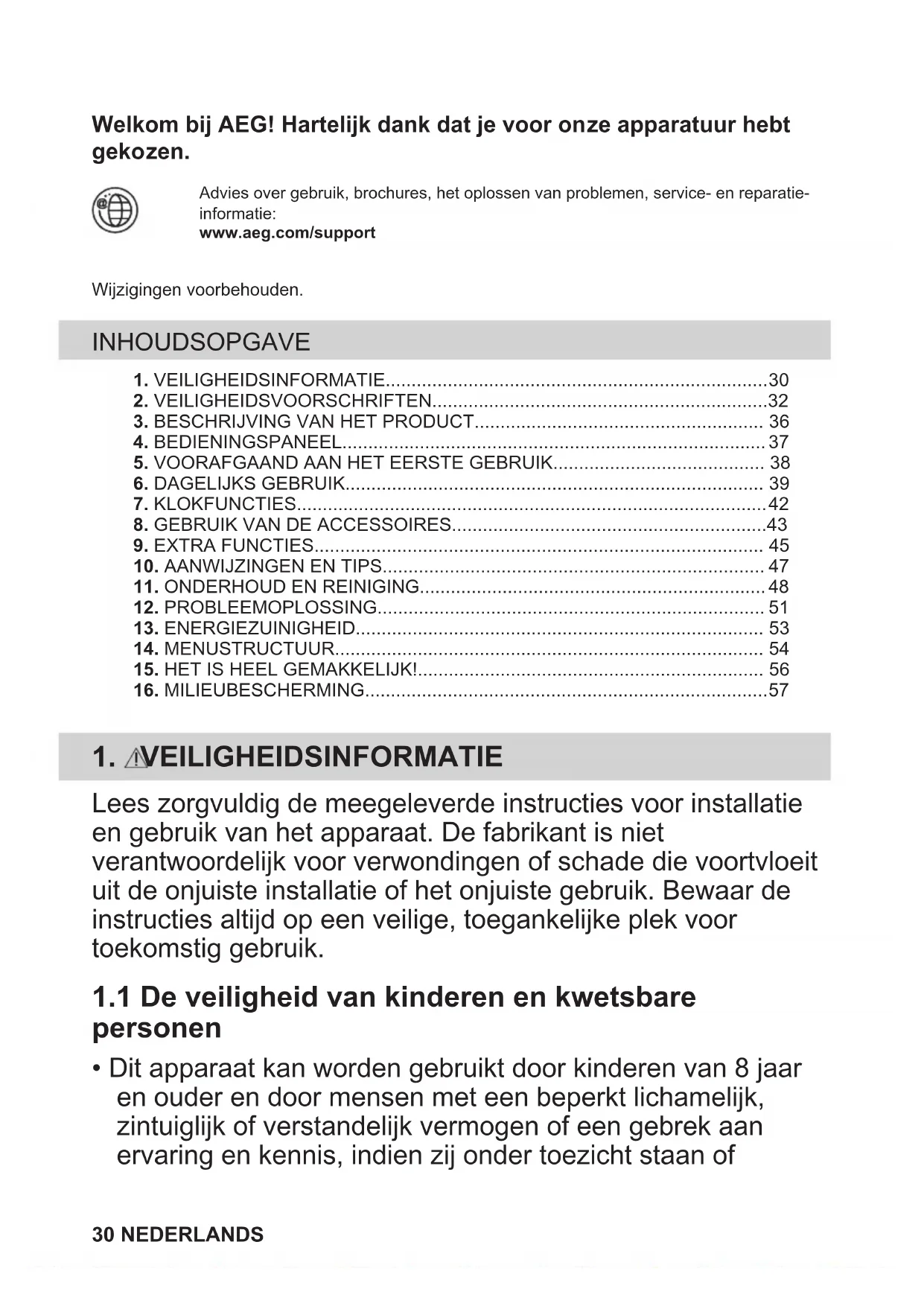 - selecteer de gewenste functie. Druk op: . Snel uit Schakel het appa‐ raat op elk gewenst moment uit, vanuit elk scherm of bij elk bericht. - ingedrukt houden tot het apparaat uitschakelt. Begin met koken Stap 1 Stap 2 Stap 3 Stap 4 Stap 5 - indrukken om het apparaat in te scha‐ kelen. - selecteer de ver‐ warmingsfunctie. Instellen: tempera‐ tuur. - druk hierop om te bevestigen. - druk hierop om te beginnen met koken. Leer snel koken Gebruik de automatische programma’s om snel een gerecht te koken met de standaardinstellingen: Kook- En Bakas‐ sistent Stap 1 Stap 2 Stap 3 Stap 4 Druk op: . Druk op: . Druk op: Kook- En Bakassistent. Kies het gerecht. Gebruik snelle functies om de kooktijd in te stellen 10% Finish assist Gebruik 10% Finish assist om extra tijd toe te voegen wanneer 10% van de bereidingstijd overblijft. Druk op +1min om de bereidingstijd te verlengen. 56 NEDERLANDS16. MILIEUBESCHERMING Recycleer de materialen met het symbool . Gooi de verpakking in een geschikte afvalcontainer om het te recycleren. Bescherm het milieu en de volksgezondheid en recycleer op een correcte manier het afval van elektrische en elektronische apparaten. Gooi apparaten gemarkeerd met het symbool niet weg met het huishoudelijk afval. Breng het product naar het milieustation bij u in de buurt of neem contact op met de gemeente. NEDERLANDS 57Welcome to AEG! Thank you for choosing our appliance. Get usage advice, brochures, trouble shooter, service and repair information:www.aeg.com/supportSubject to change without notice. CONTENTS