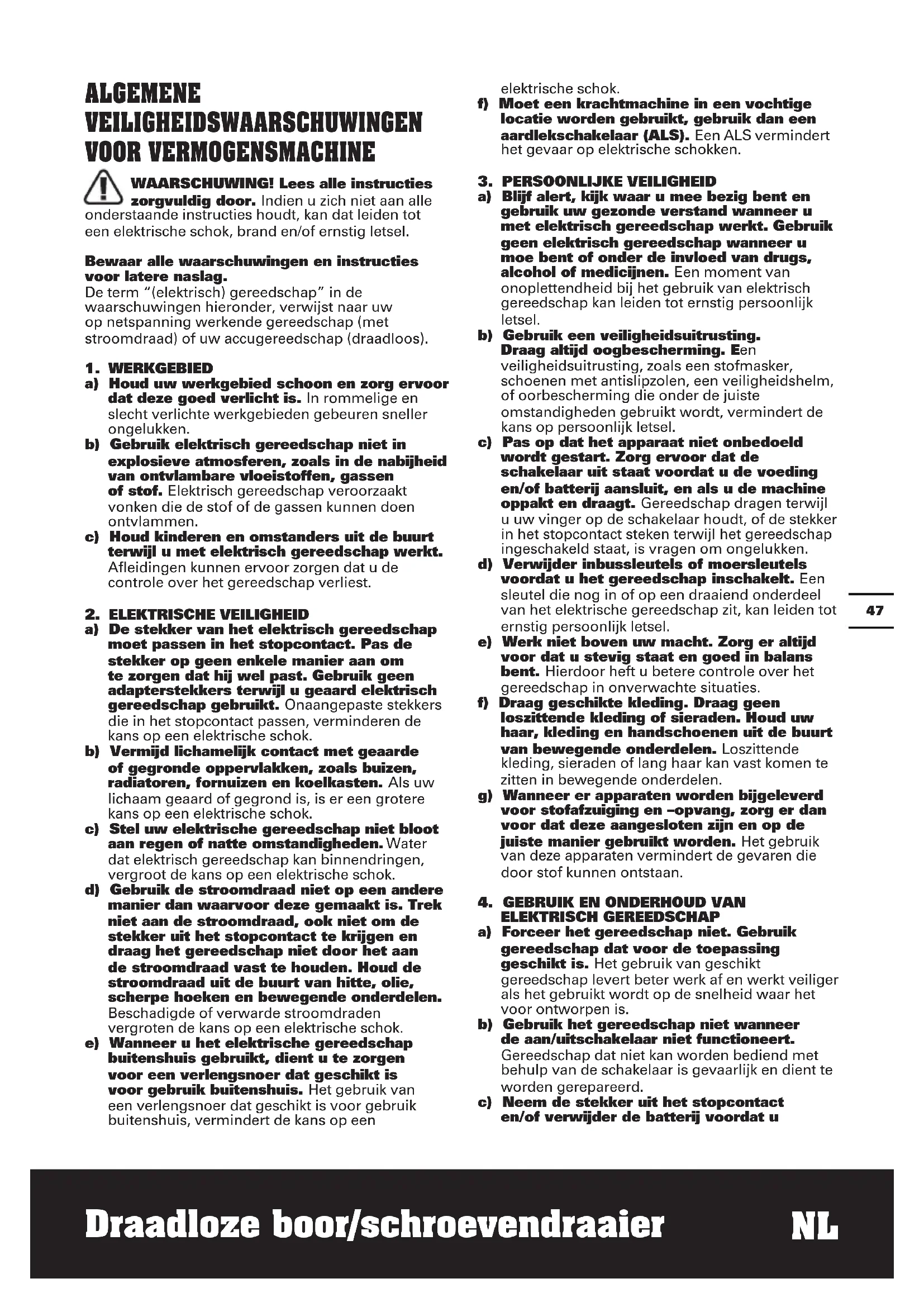 ALGEMENE VEILIGHEIDSWAARSCHUWINGEN VOOR VERMOGENSMACHINE WAARSCHUWING! Lees alle instructies zorgvuldig door. Indien u zich niet aan alle onderstaande instructies houdt, kan dat leiden tot een elektrische schok, brand en/of ernstig letsel. Bewaar alle waarschuwingen en instructies voor latere naslag. De term “(elektrisch) gereedschap” in de waarschuwingen hieronder, verwijst naar uw op netspanning werkende gereedschap (met stroomdraad) of uw accugereedschap (draadloos).