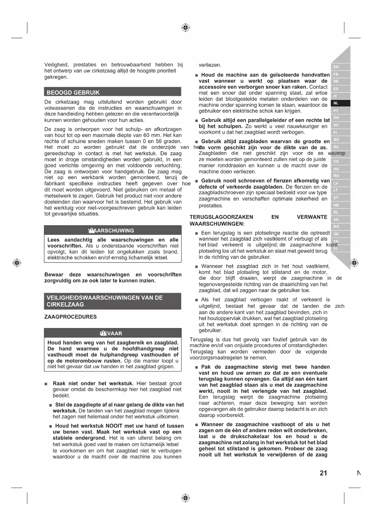 plotseling los uit het werkstuk en slaat met geweld terug in de richting van de gebruiker. Ŷ Wanneer het zaagblad zich in het hout vastklemt, komt het blad plotseling tot stilstand en de motor, GLH GRRU EOLMIW GUDDLHQ ZHUSW GH ]DDJPDFKLQH LQ GH tegenovergestelde richting van de draairichting van het zaagblad, dat wil zeggen naar de gebruiker toe. Ŷ Als het zaagblad verbogen raakt of verkeerd is XLWJHOLMQG EHVWDDW KHW JHYDDU GDW GH WDQGHQ GLH ]LFK aan de andere kant van het zaagblad bevinden, zich in het houtoppervlak drukken, wat het zaagblad plotseling uit het werkstuk doet springen in de richting van de gebruiker. Terugslag is dus het gevolg van foutief gebruik van de PDFKLQHHQRIYDQRQMXLVWHSURFHGXUHVRIRPVWDQGLJKHGHQ Terugslag kan worden vermeden door de volgende voorzorgsmaatregelen te nemen. Ŷ Pak de zaagmachine stevig met twee handen vast en houd uw armen zo dat ze een eventuele terugslag kunnen opvangen. Ga altijd aan één kant van het zaagblad staan als u met de zaagmachine werkt, nooit in het verlengde van het zaagblad. Een terugslag werpt de zaagmachine plotseling naar achteren, maar deze beweging kan worden opgevangen als de gebruiker daarop bedacht is en zich daarop voorbereidt. Ŷ Wanneer de zaagmachine vastloopt of als u het zagen om de één of andere reden wilt onderbreken, laat u de drukschakelaar los en houd u de zaagmachine net zolang in het werkstuk tot het blad geheel tot stilstand is gekomen. Probeer de zaag nooit uit het werkstuk te verwijderen of de zaag22 | Nederlands terug te trekken wanneer het blad in beweging is, anders kan deze terugslaan. Als het zaagblad zich vastklemt, dient u de oorzaak daarvan op te zoeken en de nodige maatregelen nemen om te voorkomen dat het nog eens gebeurt. Ŷ Voordat u de zaagmachine opnieuw aanzet om door te gaan met zagen, dient u het zaagblad goed uit te lijnen met de zaagsnede en te zorgen dat de tanden niet in aanraking zijn met het werkstuk. Als het zaagblad zit vastgeklemd in het werkstuk, bestaat het gevaar dat er een terugslag optreedt zodra u de zaagmachine aanzet. Ŷ Ondersteun lange werkstukken om te voorkomen dat het zaagblad vast komt te zitten en om op die manier het gevaar van terugslag te vermijden. Lange werkstukken hebben de neiging onder hun eigen gewicht door te buigen. U kunt aan twee kanten van KHW ZHUNVWXN YRRU RQGHUVWHXQLQJ ]RUJHQ GLFKW ELM GH ]DDJOLMQHQDDQKHWXLWHLQGHYDQKHWZHUNVWXN Ŷ Gebruik geen botte of beschadigde zaagbladen. Botte of verkeerd gemonteerde zaagbladen veroorzaken een dunne snede die een buitengewone