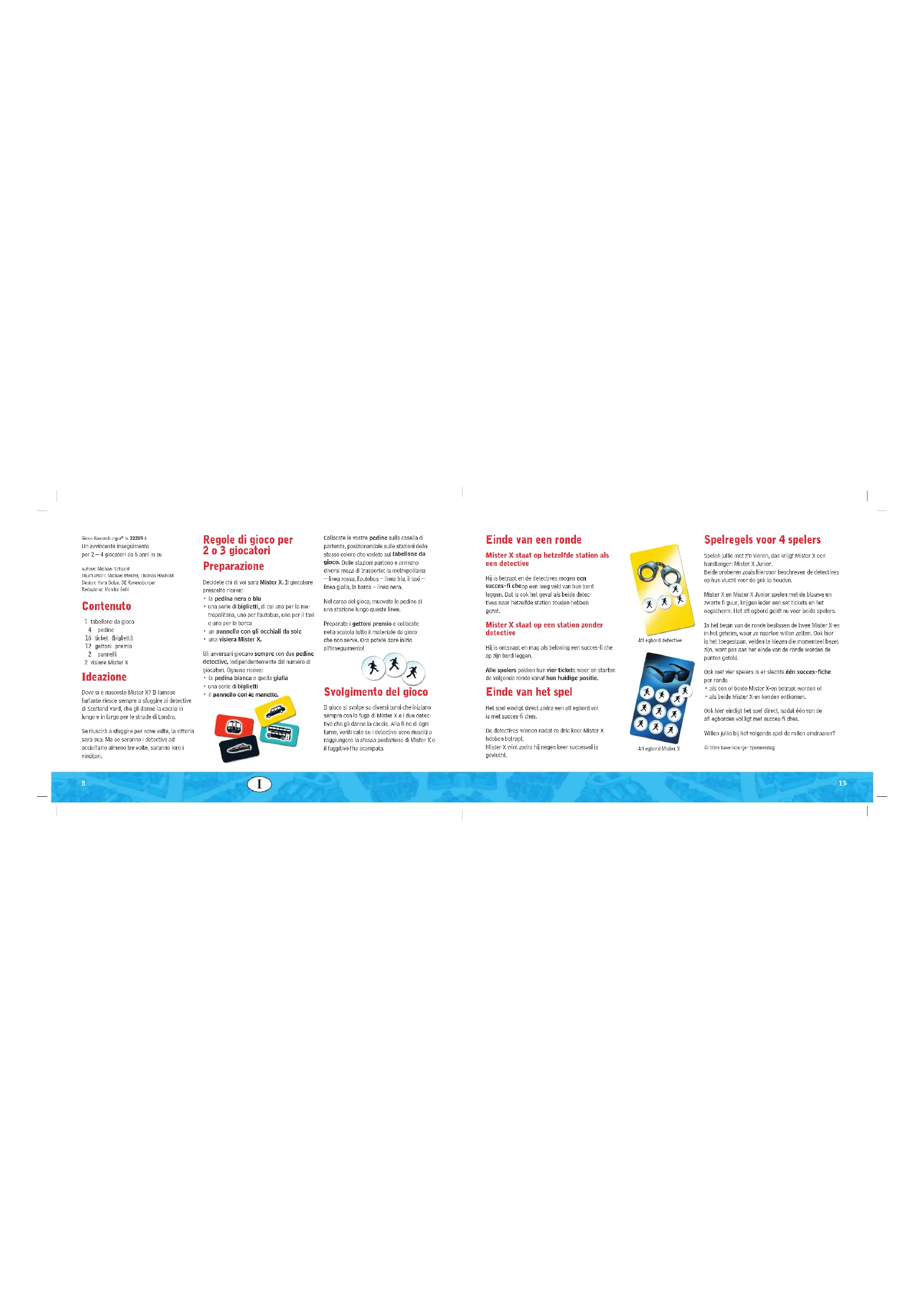 Spelregels voor 4 spelers Spelen jullie met z’n vieren, dan krijgt Mister X een handlanger: Mister X Junior. Beide proberen zoals hiervoor beschreven de detectives op hun vlucht voor de gek te houden. Mister X en Mister X Junior spelen met de blauwe en zwarte fi guur, krijgen ieder een set tickets en het oogscherm. Het afl egbord geldt nu voor beide spelers. In het begin van de ronde beslissen de twee Mister X-en in het geheim, waar ze naartoe willen zetten. Ook hier is het toegestaan, velden te kiezen die momenteel bezet zijn, want pas aan het einde van de ronde worden de punten geteld. Ook met vier spelers is er slechts één succes-fi che per ronde