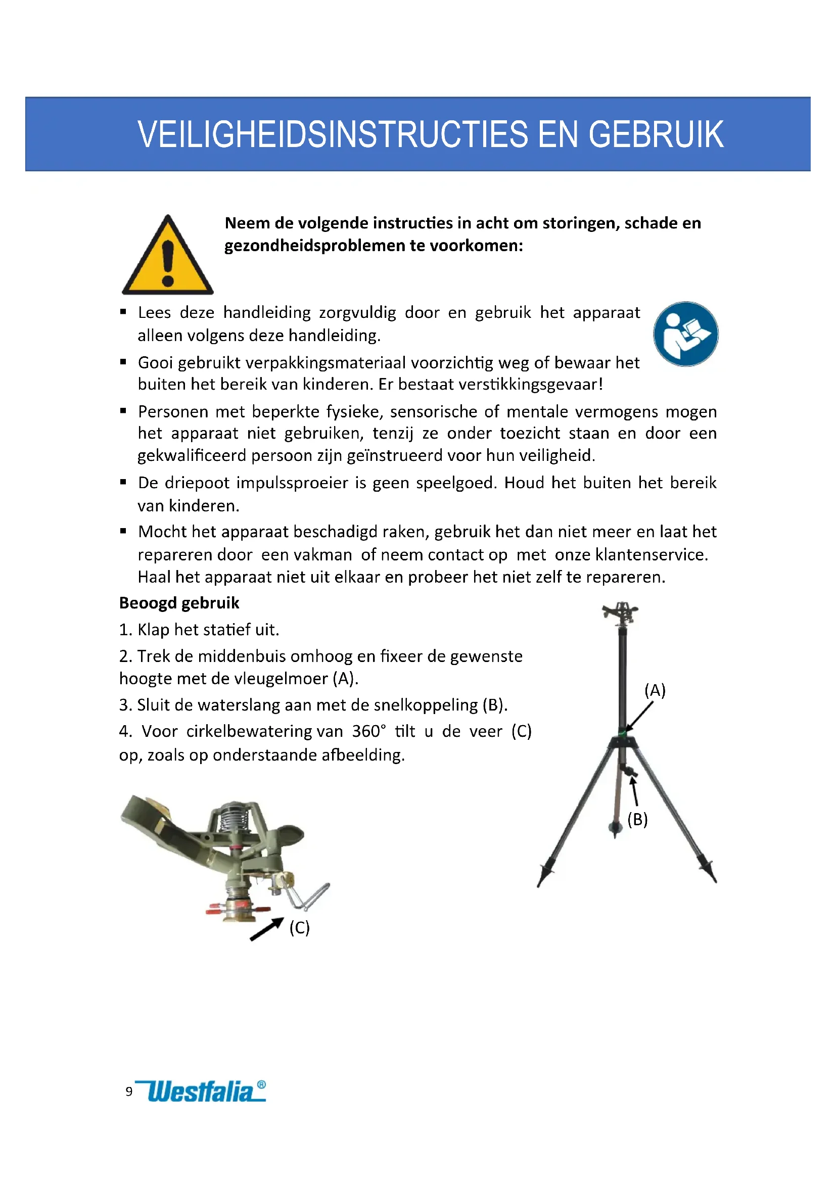 Lees deze handleiding zorgvuldig door en gebruik het apparaat alleen volgens deze handleiding. Gooi gebruikt verpakkingsmateriaal voorzichtig weg of bewaar het buiten het bereik van kinderen. Er bestaat verstikkingsgevaar! Personen met beperkte fysieke, sensorische of mentale vermogens mogen het apparaat niet gebruiken, tenzij ze onder toezicht staan en door een gekwalificeerd persoon zijn geïnstrueerd voor hun veiligheid. De driepoot impulssproeier is geen speelgoed. Houd het buiten het bereik van kinderen. Mocht het apparaat beschadigd raken, gebruik het dan niet meer en laat het repareren door een vakman of neem contact op met onze klantenservice. Haal het apparaat niet uit elkaar en probeer het niet zelf te repareren. Beoogd gebruik