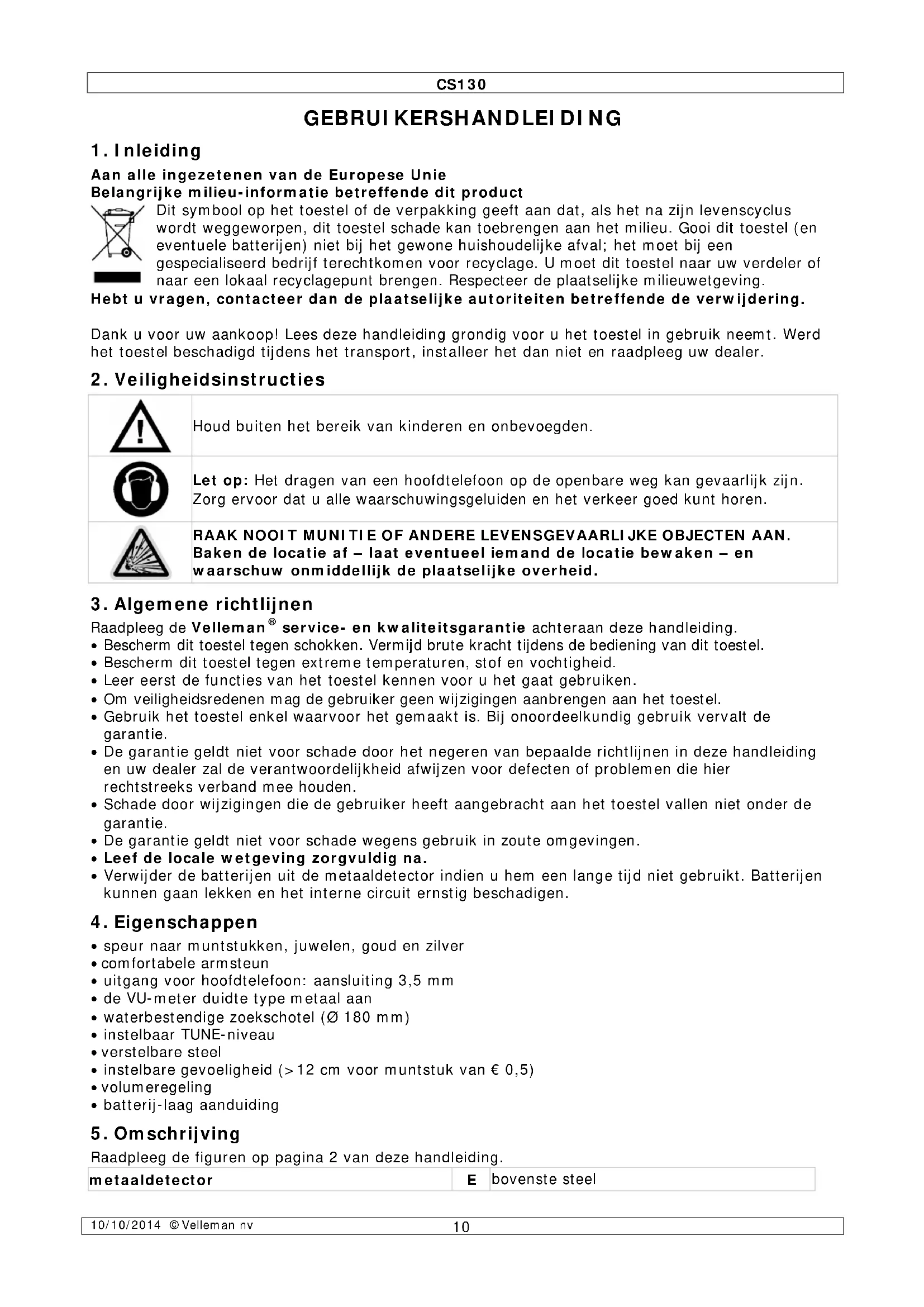 - Een ervaren gebruiker heeft, nog voor hij begint te vragen, al een goed idee over de grootte, vorm en diepte van het voorwerp. De aard van het geluidssignaal is hierbij een belangrijke leidraad. U moet altijd luisteren naar de specifieke kenmerken van een signaal. Probeer het gebied af te bakenen waarbinnen de detector een signaal genereert en begin pas dan te graven.CS130 10/10/2014 © Velleman nv