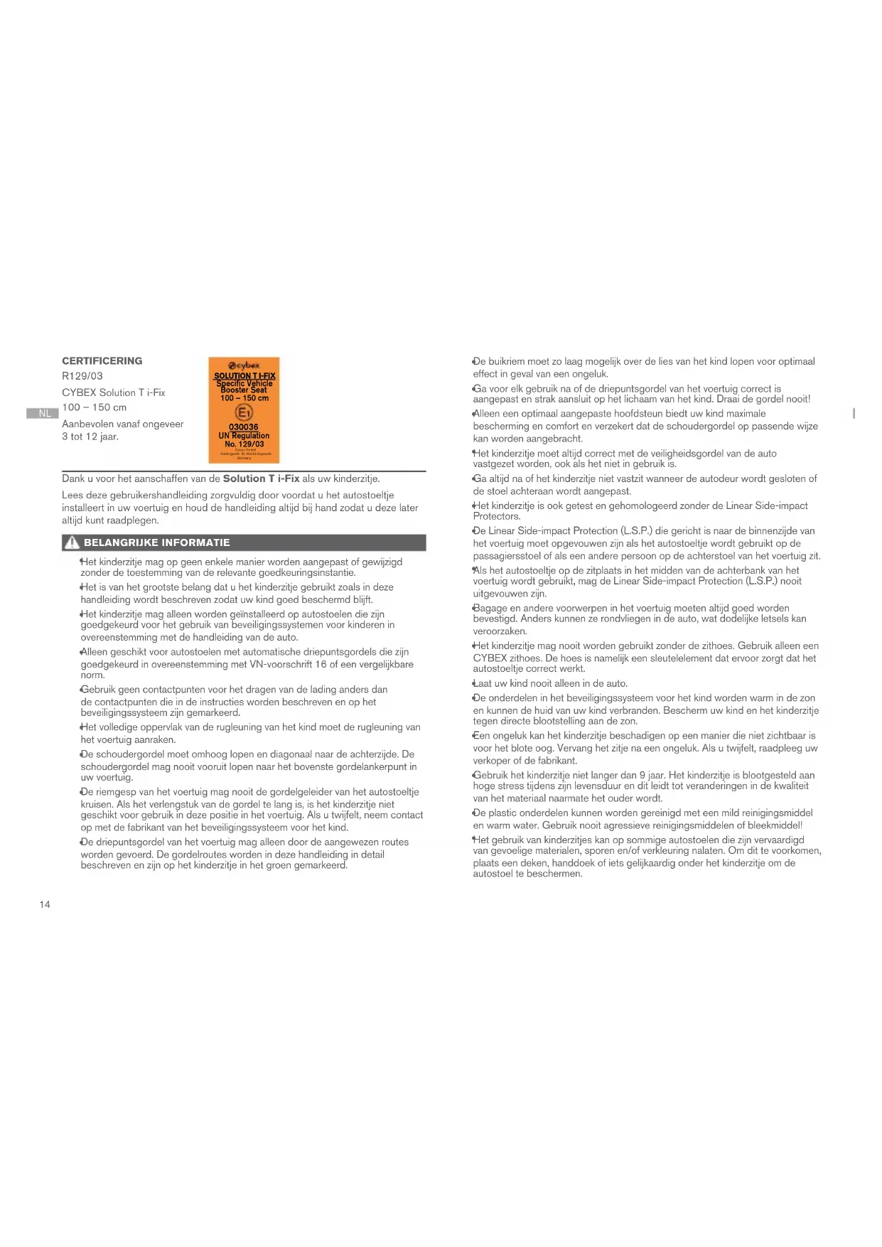 Cybex GmbHRiedingerstr. 18, 95448 BayreuthGermany UN Regulation No. 129/03 Dank u voor het aanschaffen van de Solution T i-Fix als uw kinderzitje. Lees deze gebruikershandleiding zorgvuldig door voordat u het autostoeltje installeert in uw voertuig en houd de handleiding altijd bij hand zodat u deze later altijd kunt raadplegen. BELANGRIJKE INFORMATIE