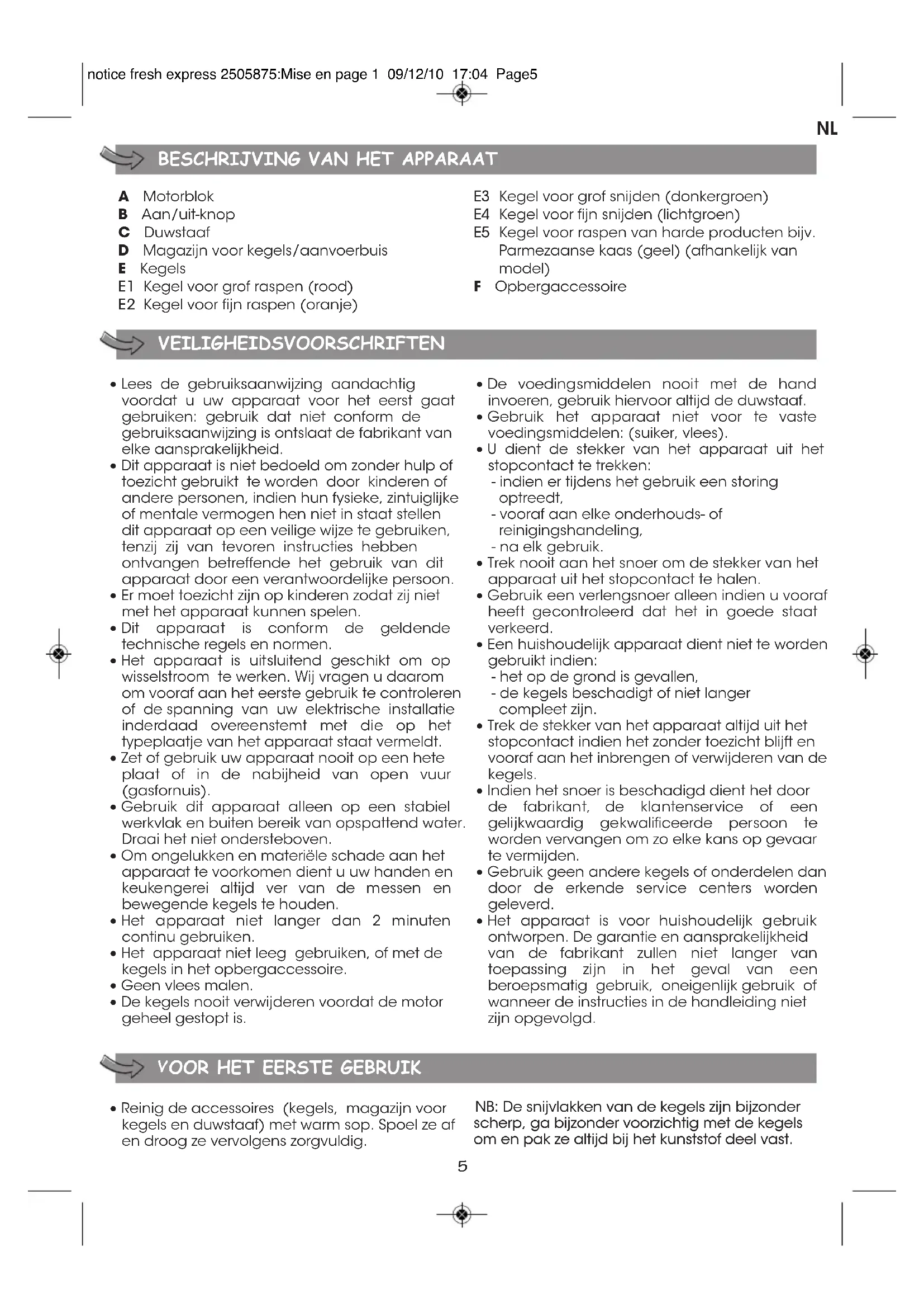 ELEKTRISCH OF ELEKTRONISCH PRODUCT AAN HET EIND VAN DE LEVENSCYCLUS Uw apparaat werd ontworpen om gedurende vele jaren dienst te doen. Wanneer u echter op een dag besluit het te vervangen, werp het dan niet met het huisvuil weg maar breng het naar het hiervoor door de gemeente ingerichte verzamelpunt (of een milieustraat indien van toepassing). Help het milieu te beschermen! Uw apparaat bevat talrijke materialen die hergebruikt of gerecycled kunnen worden. Breng het naar een daarvoor bestemd verzamelpunt zodat het apparaat verwerkt kan worden. notice fresh express 2505875:Mise en page 1 09/12/10 17:04 Page89 A Motor unit B On/off switch C Pusher D Cone holder/ feed tube E Cones