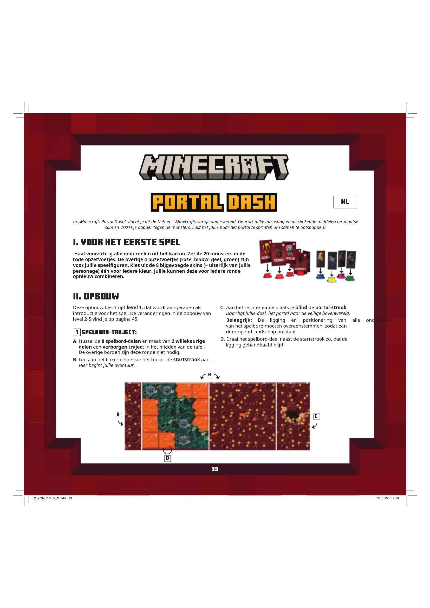 - Monster-soorten: Het magmablok, Ghasts en Endermen zijn steeds in het spel (= level 0). Elk ander monstersoort (Hoglin, Blazes, Wither Skeletons) die jullie toevoegen, verhoogt het level met 1. Level 2 Hussel de 3 Hoglins tussen de overige monsters in de rij. Gebruik de oeroude Hoglin in plaats van de Wildre als eindbaas en draai zijn eindbaas-bord op de eenvoudige zijde. De overige spelopbouw blijft onveranderd. Level 3 Hussel de 3 Hoglins en de 3 Blazes tussen de overige monsters in de rij. Je kunt kiezen, welke van de twee eindbazen je wilt gebruiken – draai het bord van die eindbaas op de eenvoudige kant. De overige spelopbouw blijft onveranderd. Level 4 Verleng het traject met een derde spelbord-deel en bekijk de ligging. Gebruik de Wildre als eindbaas en draai hem op de moeilijke kant. De overige spelopbouw blijft onveranderd, er zijn dus alleen magmablokken, Ghast en Endermen in het spel. Level 5 Hussel alle extra montersoorten (Hoglins, Blazes en Wither Skeletons) tussen de rij. Gebruik de oeroude Hoglin als eindbaas en draai zijn bord op de moeilijke kant. De overige spelopbouw blijft onveranderd, het traject bestaat dus slechts uit 2 spelbord-delen. 239737_27462_X.indd 45239737_27462_X.indd 45 13.05.22 14:3913.05.22 14:3946
