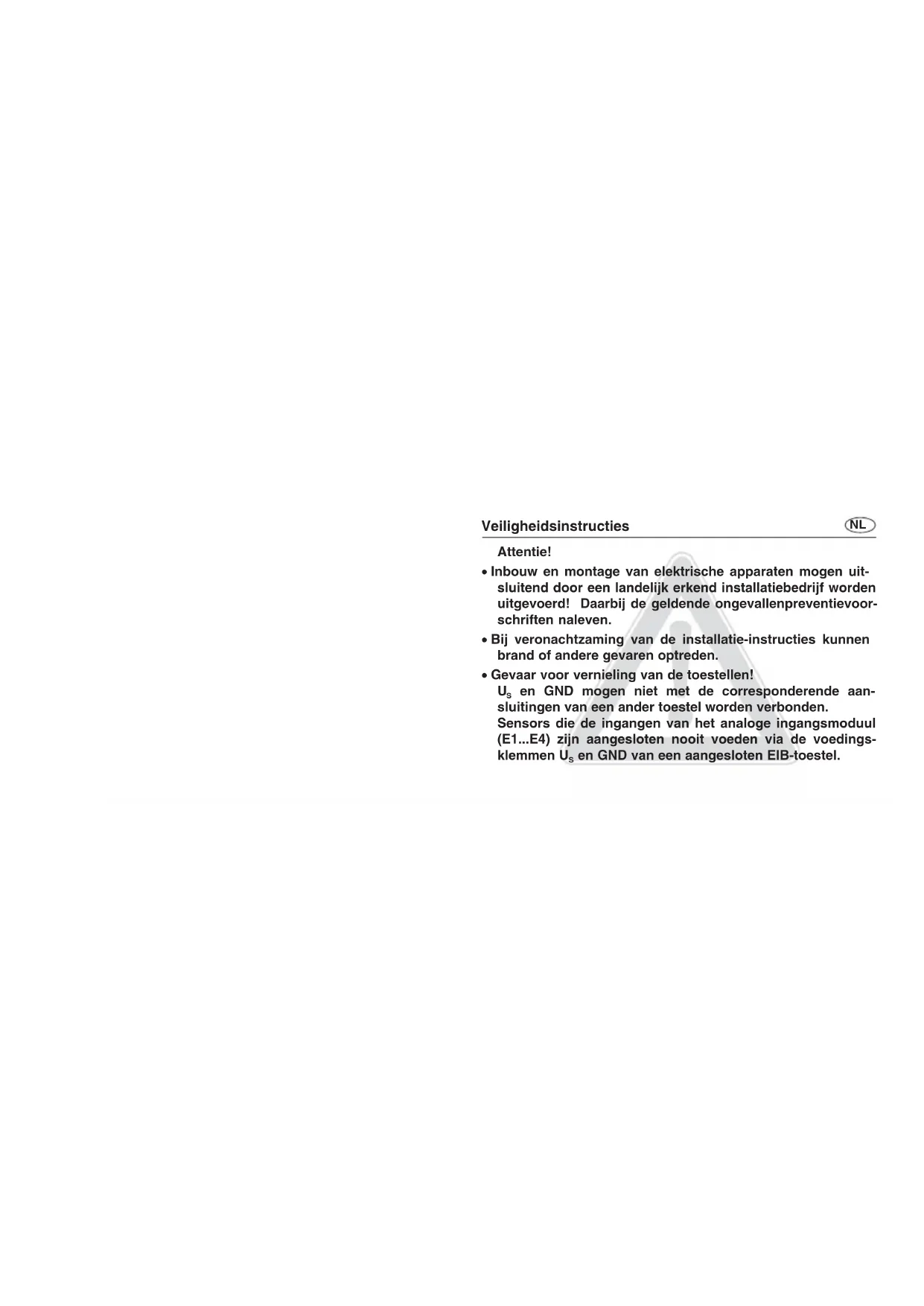 - Verwijdering of toevoeging van modules zonder aanpassing van de configuratie en aansluitend downloaden naar het KNX/EIB- toestel is niet toegestaan, omdat dit functiestoringen in het systeem veroorzaakt. Installatie van een analoog ingangsmoduul NLAansluitbare sensors