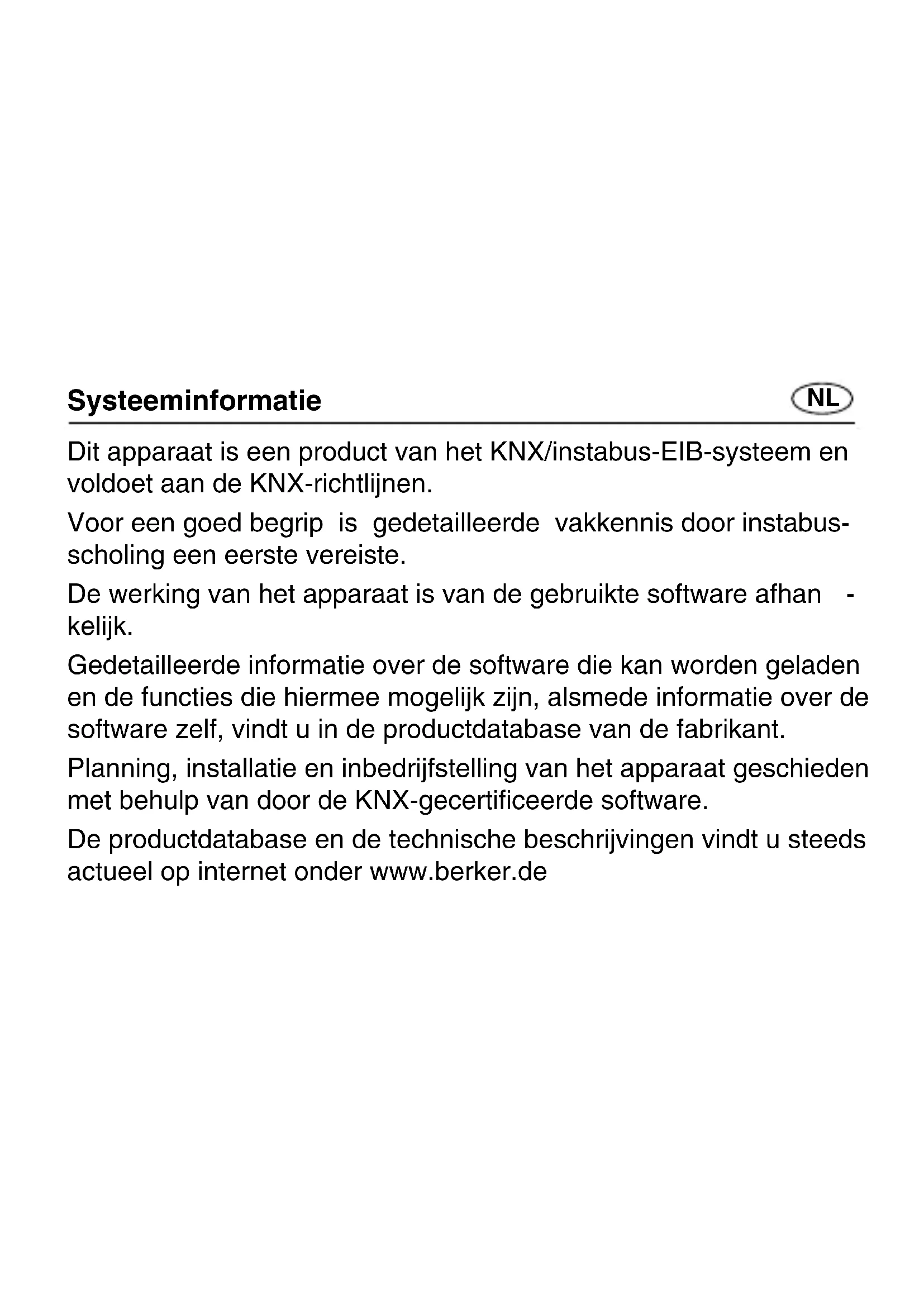 kelijk. Gedetailleerde informatie over de software die kan worden geladen en de functies die hiermee mogelijk zijn, alsmede informatie over de software zelf, vindt u in de productdatabase van de fabrikant. Planning, installatie en inbedrijfstelling van het apparaat geschieden met behulp van door de KNX-gecertificeerde software. De productdatabase en de technische beschrijvingen vindt u steeds actueel op internet onder www.berker.de Systeeminformatie NLVeiligheidsinstructies