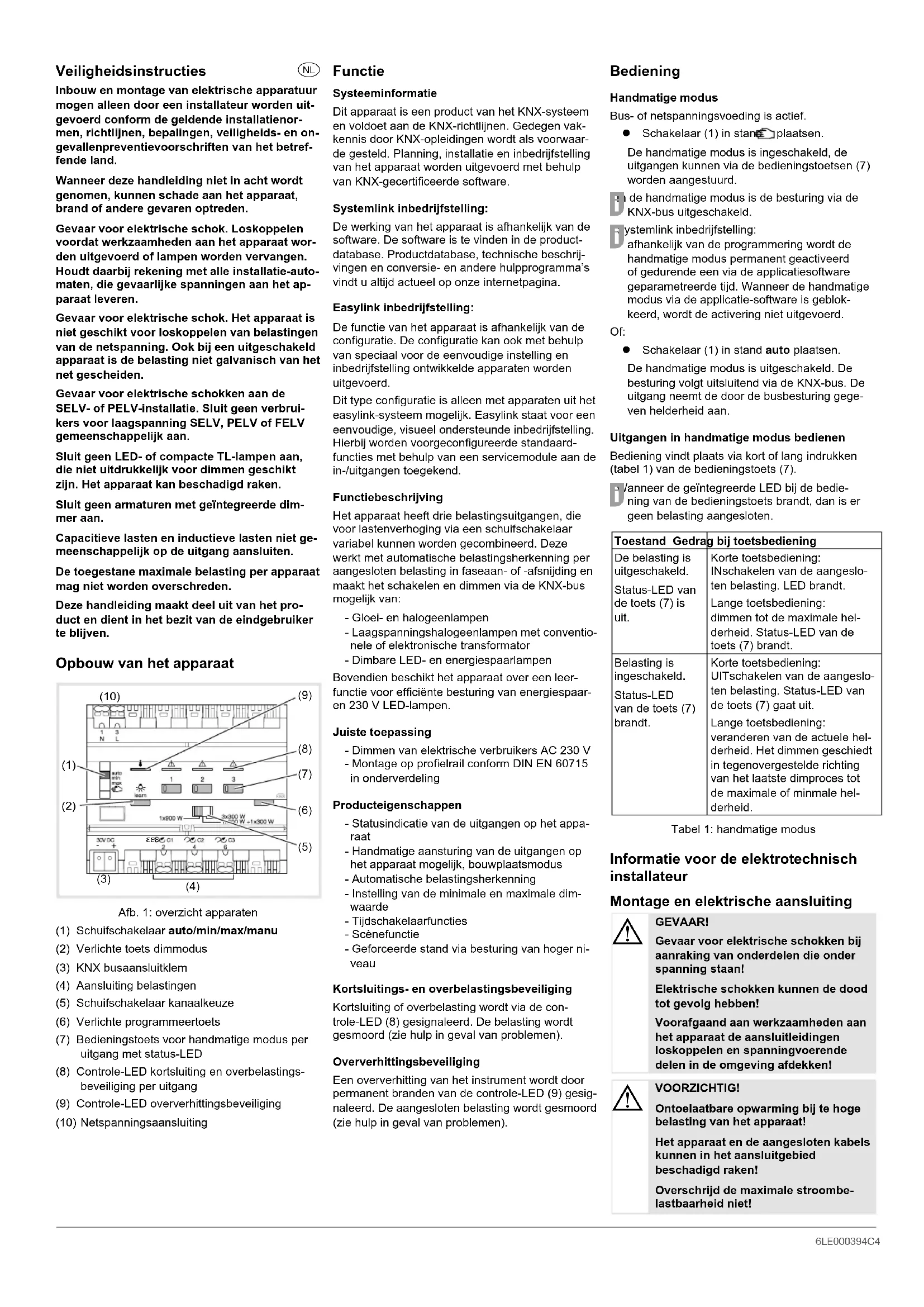 Functie Systeeminformatie Dit apparaat is een product van het KNX-systeem en voldoet aan de KNX-richtlijnen. Gedegen vak- kennis door KNX-opleidingen wordt als voorwaar- de gesteld. Planning, installatie en inbedrijfstelling van het apparaat worden uitgevoerd met behulp van KNX-gecerticeerde software. Systemlink inbedrijfstelling: De werking van het apparaat is afhankelijk van de software. De software is te vinden in de product- database. Productdatabase, technische beschrij- vingen en conversie- en andere hulpprogramma’s vindt u altijd actueel op onze internetpagina. Easylink inbedrijfstelling: De functie van het apparaat is afhankelijk van de conguratie. De conguratie kan ook met behulp van speciaal voor de eenvoudige instelling en inbedrijfstelling ontwikkelde apparaten worden uitgevoerd. Dit type conguratie is alleen met apparaten uit het easylink-systeem mogelijk. Easylink staat voor een eenvoudige, visueel ondersteunde inbedrijfstelling. Hierbij worden voorgecongureerde standaard- functies met behulp van een servicemodule aan de in-/uitgangen toegekend. Functiebeschrijving Het apparaat heeft drie belastingsuitgangen, die voor lastenverhoging via een schuifschakelaar variabel kunnen worden gecombineerd. Deze werkt met automatische belastingsherkenning per aangesloten belasting in faseaan- of -afsnijding en maakt het schakelen en dimmen via de KNX-bus mogelijk van: - Gloei- en halogeenlampen - Laagspanningshalogeenlampen met conventio- nele of elektronische transformator - Dimbare LED- en energiespaarlampen Bovendien beschikt het apparaat over een leer- functie voor efciënte besturing van energiespaar- en 230 V LED-lampen. Juiste toepassing - Dimmen van elektrische verbruikers AC 230 V - Montage op proelrail conform DIN EN 60715 in onderverdeling Producteigenschappen - Statusindicatie van de uitgangen op het appa- raat - Handmatige aansturing van de uitgangen op het apparaat mogelijk, bouwplaatsmodus - Automatische belastingsherkenning - Instelling van de minimale en maximale dim- waarde - Tijdschakelaarfuncties - Scènefunctie - Geforceerde stand via besturing van hoger ni- veau Kortsluitings- en overbelastingsbeveiliging Kortsluiting of overbelasting wordt via de con- trole-LED (8) gesignaleerd. De belasting wordt gesmoord (zie hulp in geval van problemen). Oververhittingsbeveiliging Een oververhitting van het instrument wordt door permanent branden van de controle-LED (9) gesig- naleerd. De aangesloten belasting wordt gesmoord (zie hulp in geval van problemen). Bediening Handmatige modus Bus- of netspanningsvoeding is actief. z Schakelaar (1) in stand plaatsen. De handmatige modus is ingeschakeld, de uitgangen kunnen via de bedieningstoetsen (7) worden aangestuurd. In de handmatige modus is de besturing via de KNX-bus uitgeschakeld. Systemlink inbedrijfstelling: afhankelijk van de programmering wordt de handmatige modus permanent geactiveerd of gedurende een via de applicatiesoftware geparametreerde tijd. Wanneer de handmatige modus via de applicatie-software is geblok- keerd, wordt de activering niet uitgevoerd. Of: z Schakelaar (1) in stand auto plaatsen. De handmatige modus is uitgeschakeld. De besturing volgt uitsluitend via de KNX-bus. De uitgang neemt de door de busbesturing gege- ven helderheid aan. Uitgangen in handmatige modus bedienen Bediening vindt plaats via kort of lang indrukken (tabel 1) van de bedieningstoets (7). Wanneer de geïntegreerde LED bij de bedie- ning van de bedieningstoets brandt, dan is er geen belasting aangesloten. Toestand Gedrag bij toetsbediening De belasting is uitgeschakeld. Status-LED van de toets (7) is uit. Korte toetsbediening: INschakelen van de aangeslo- ten belasting. LED brandt. Lange toetsbediening: dimmen tot de maximale hel- derheid. Status-LED van de toets (7) brandt. Belasting is ingeschakeld. Status-LED van de toets (7) brandt. Korte toetsbediening: UITschakelen van de aangeslo- ten belasting. Status-LED van de toets (7) gaat uit. Lange toetsbediening: veranderen van de actuele hel- derheid. Het dimmen geschiedt in tegenovergestelde richting van het laatste dimproces tot de maximale of minmale hel- derheid. Tabel 1: handmatige modus Informatie voor de elektrotechnisch installateur Montage en elektrische aansluiting GEVAAR! Gevaar voor elektrische schokken bij aanraking van onderdelen die onder spanning staan! Elektrische schokken kunnen de dood tot gevolg hebben! Voorafgaand aan werkzaamheden aan het apparaat de aansluitleidingen loskoppelen en spanningvoerende delen in de omgeving afdekken!